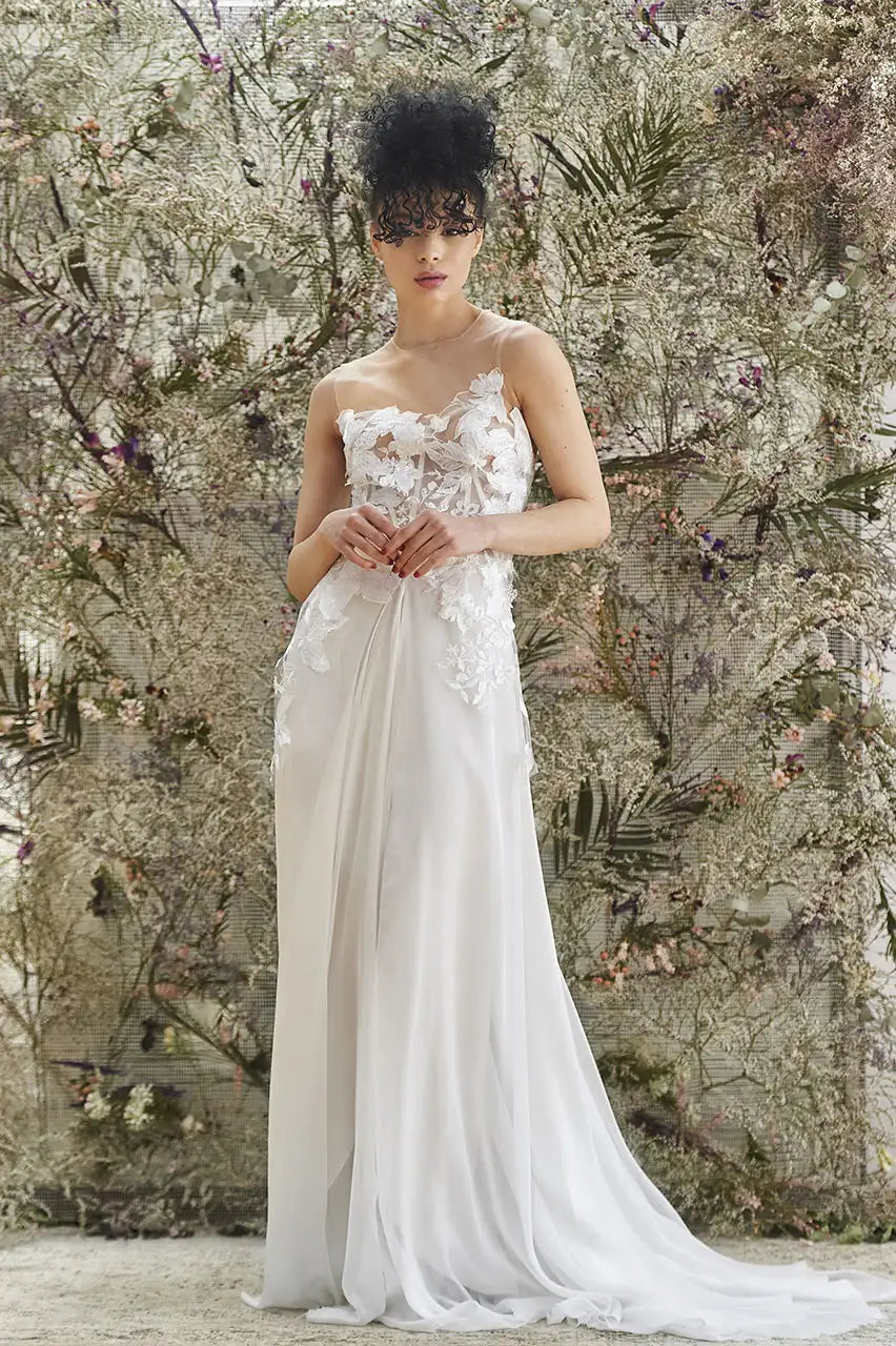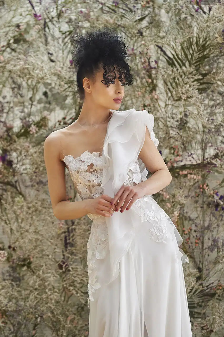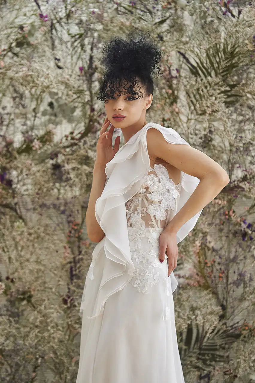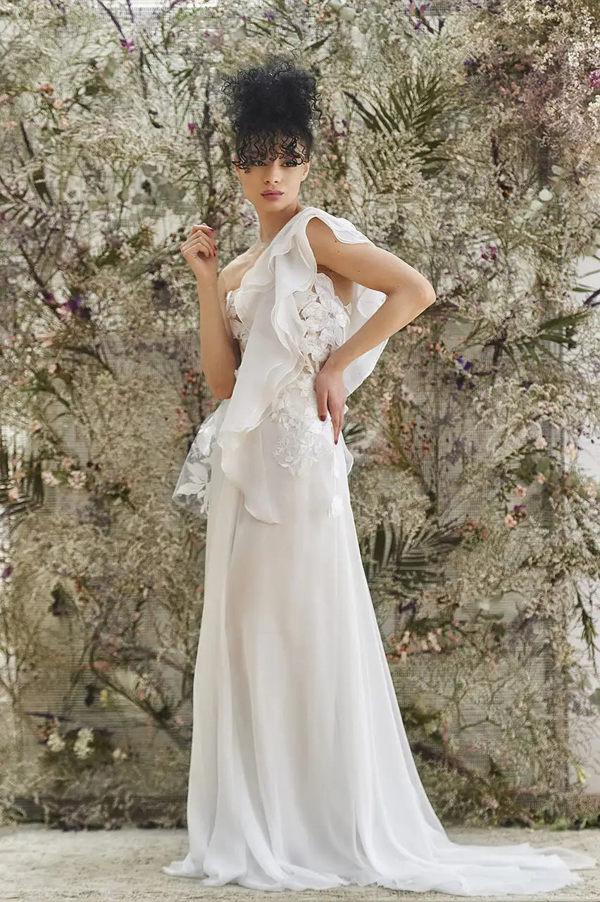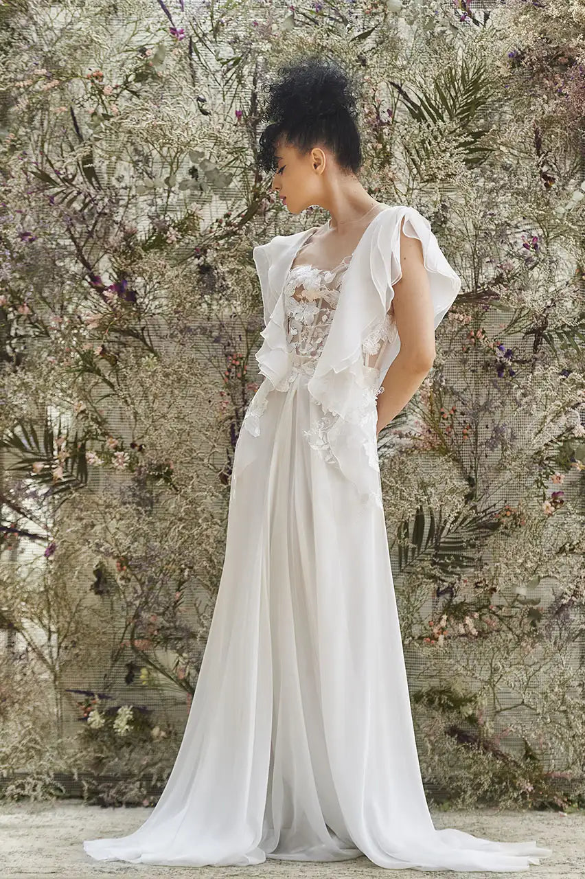 Изящна и фина копринена рокля, обшита с флорални апликации и бродерии, допълнена с авангардни напластени ръкави от структуриран копринен шифон. Подплатява се с отделна рокля, изработена от прозрачен корсет и права пола от копринен сатен.