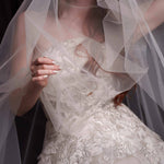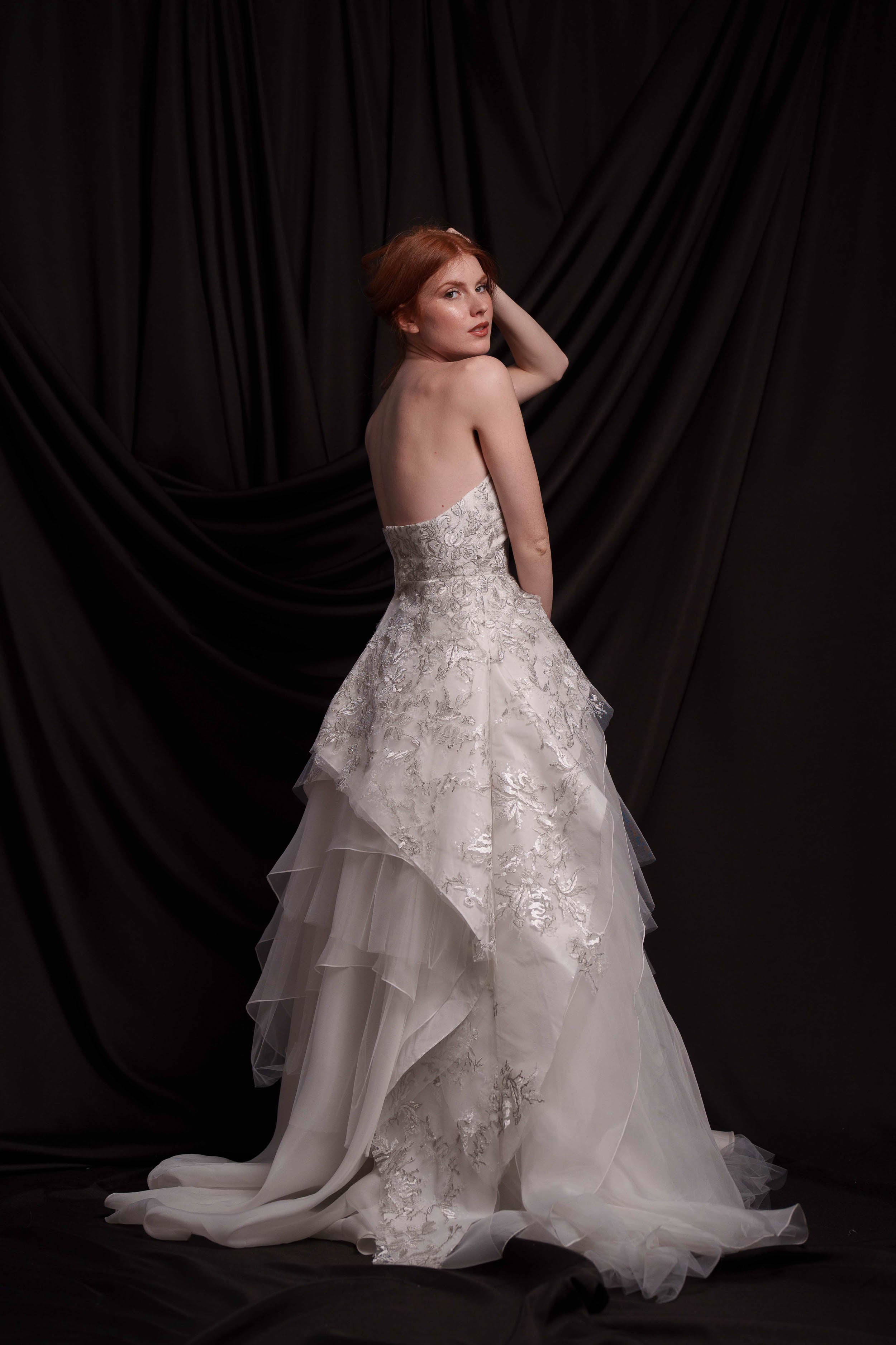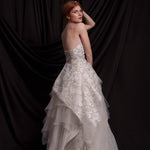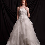 Сватбен сет от две части. Въздушна и обемна пола създадена от николко вида естествени материи - органза, шифон и тюл, комбинирана с удължен корсет, с обло деколте, покрит с изключителна Японска бродерия, създадена от няколко нюанса сребърни и бледо-златни нишки.