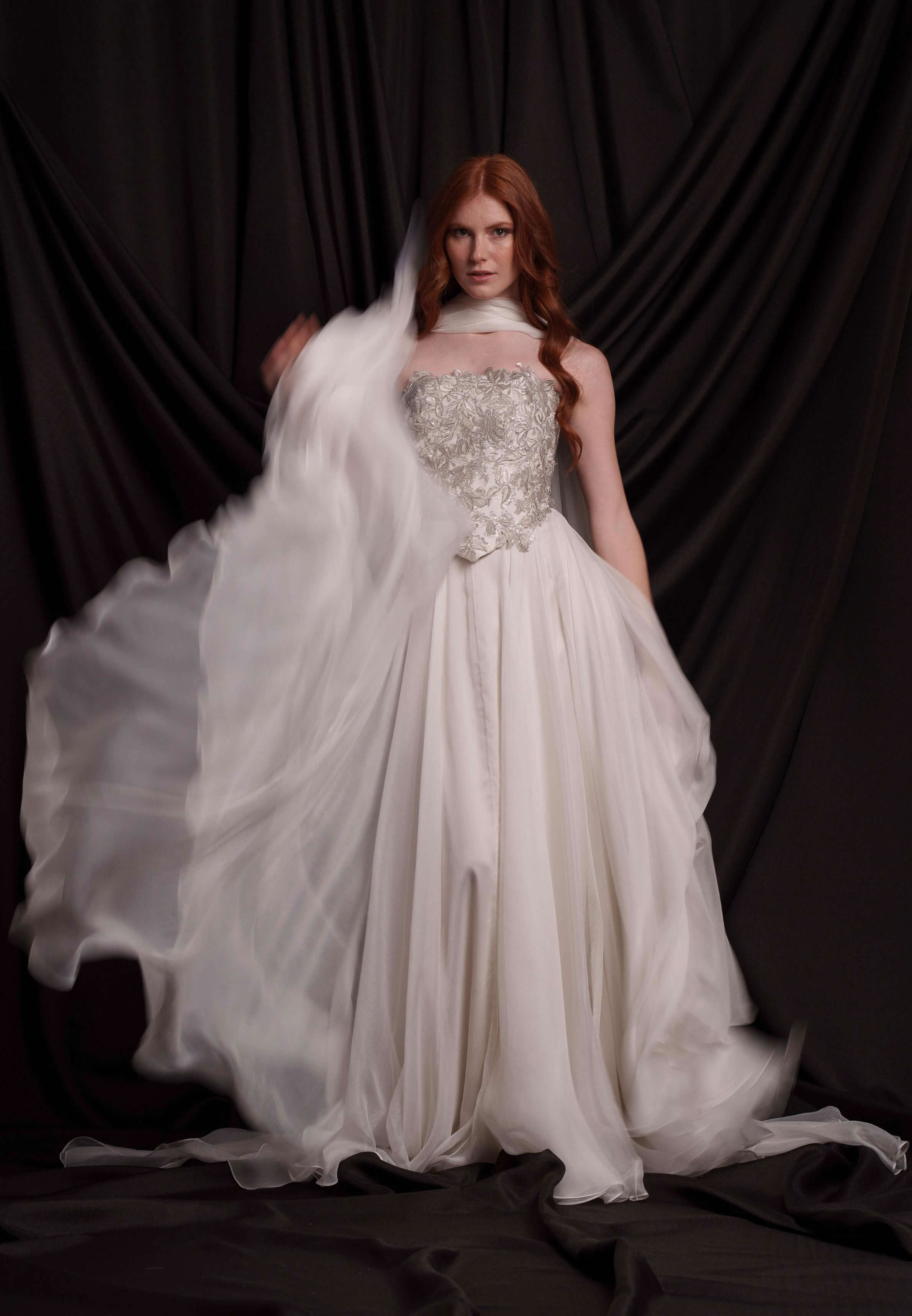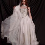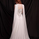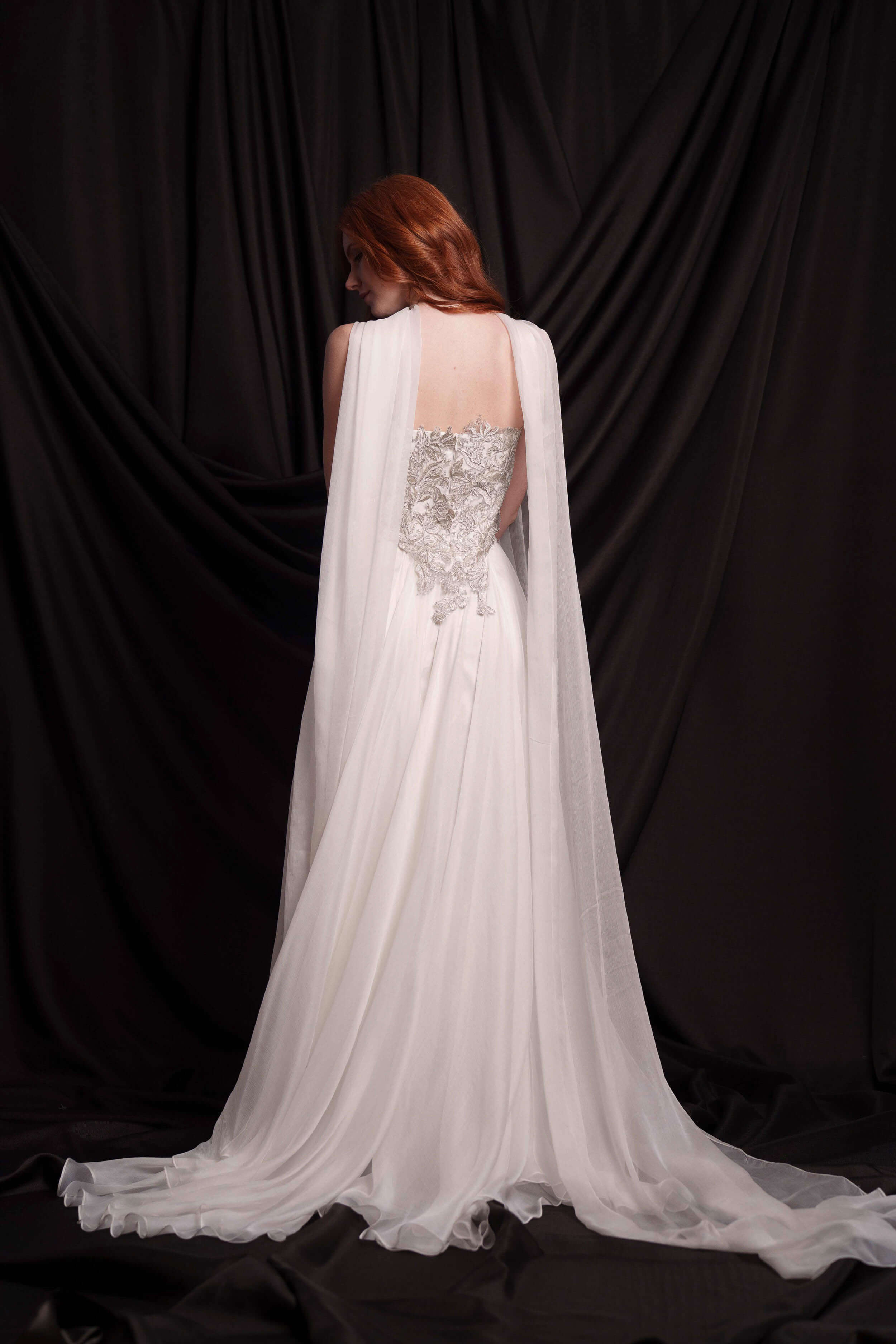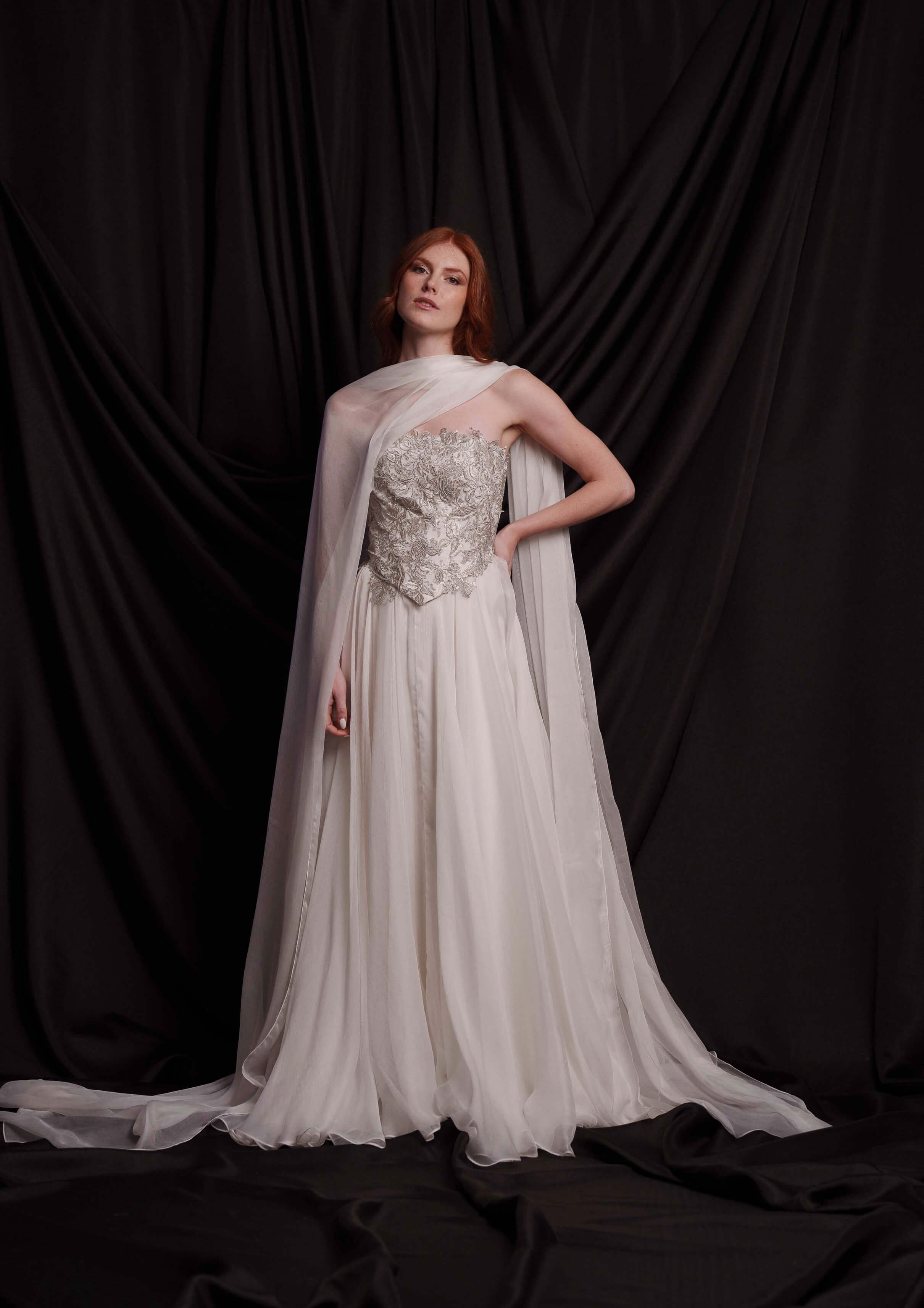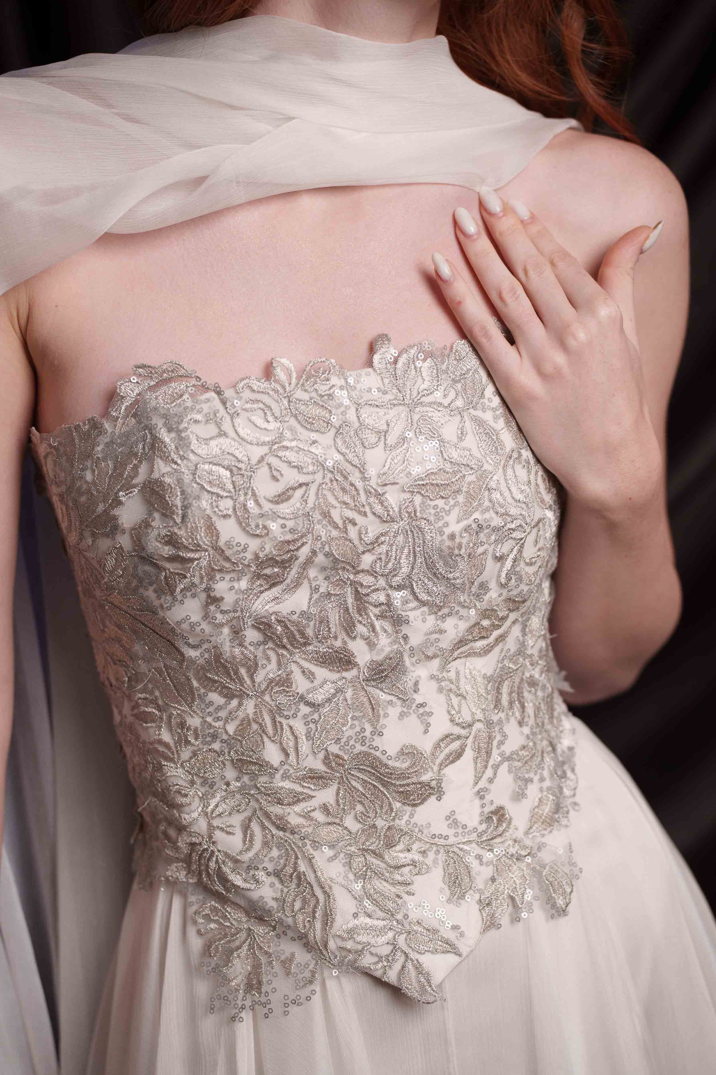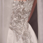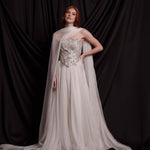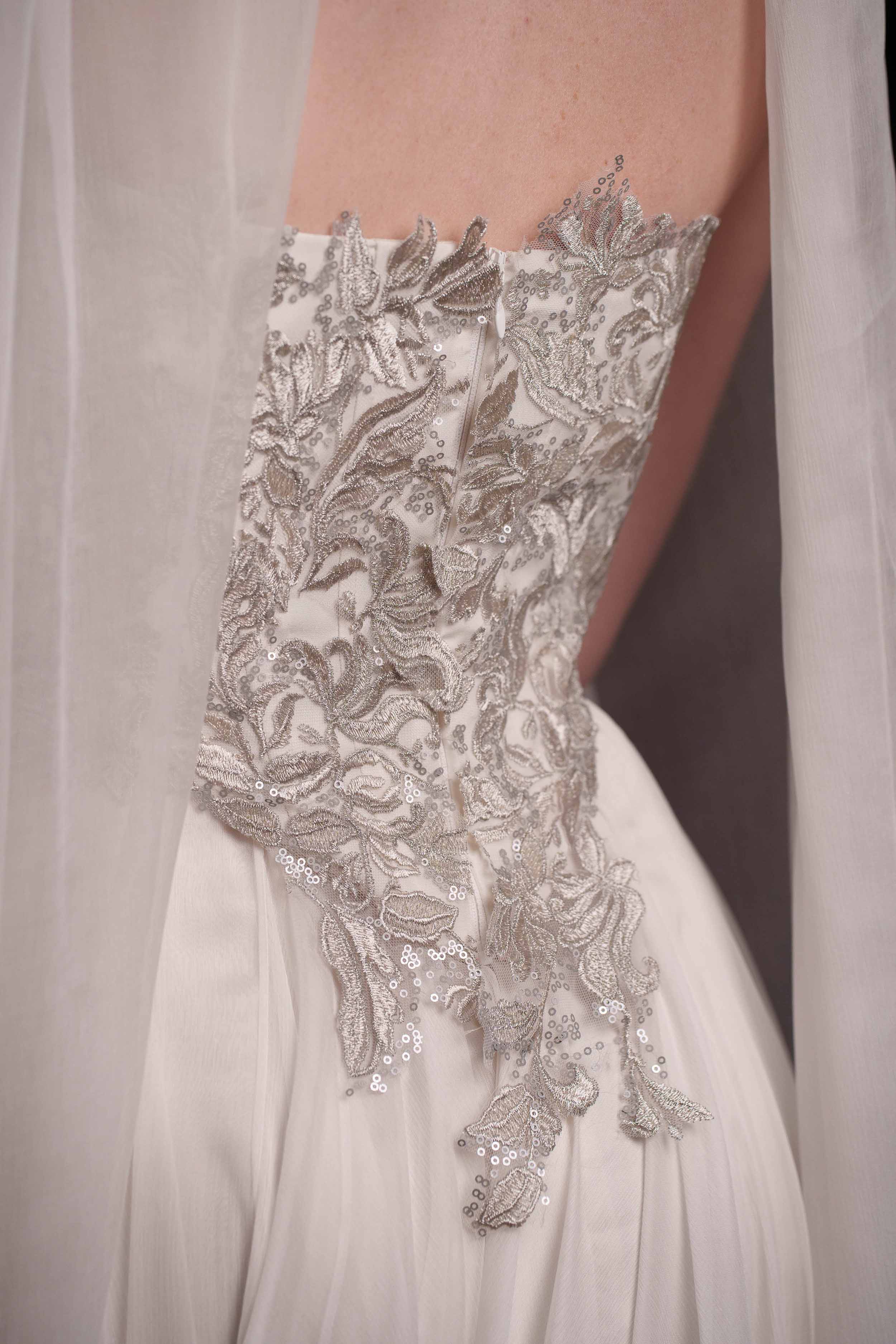 Сватбен корсет от мека копринена тафта, покрит с изцяло ръчно създадена и пришита бродерия в няколко нюанса на среброто. Съчетава се прекрасно с копринената пола от шифон ZOE и с фин копринен шал.