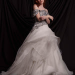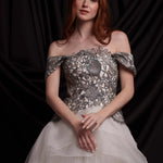 Корсет с деконструктивна форма, паднал ръкав и силно подчертана талия. Изработен от копринена тафта, покрит с ръчно изработена едра флорална дантела в няколко нюанса на сребро. Съчетава се с копринените поли ERDEM и LEILA.