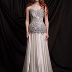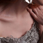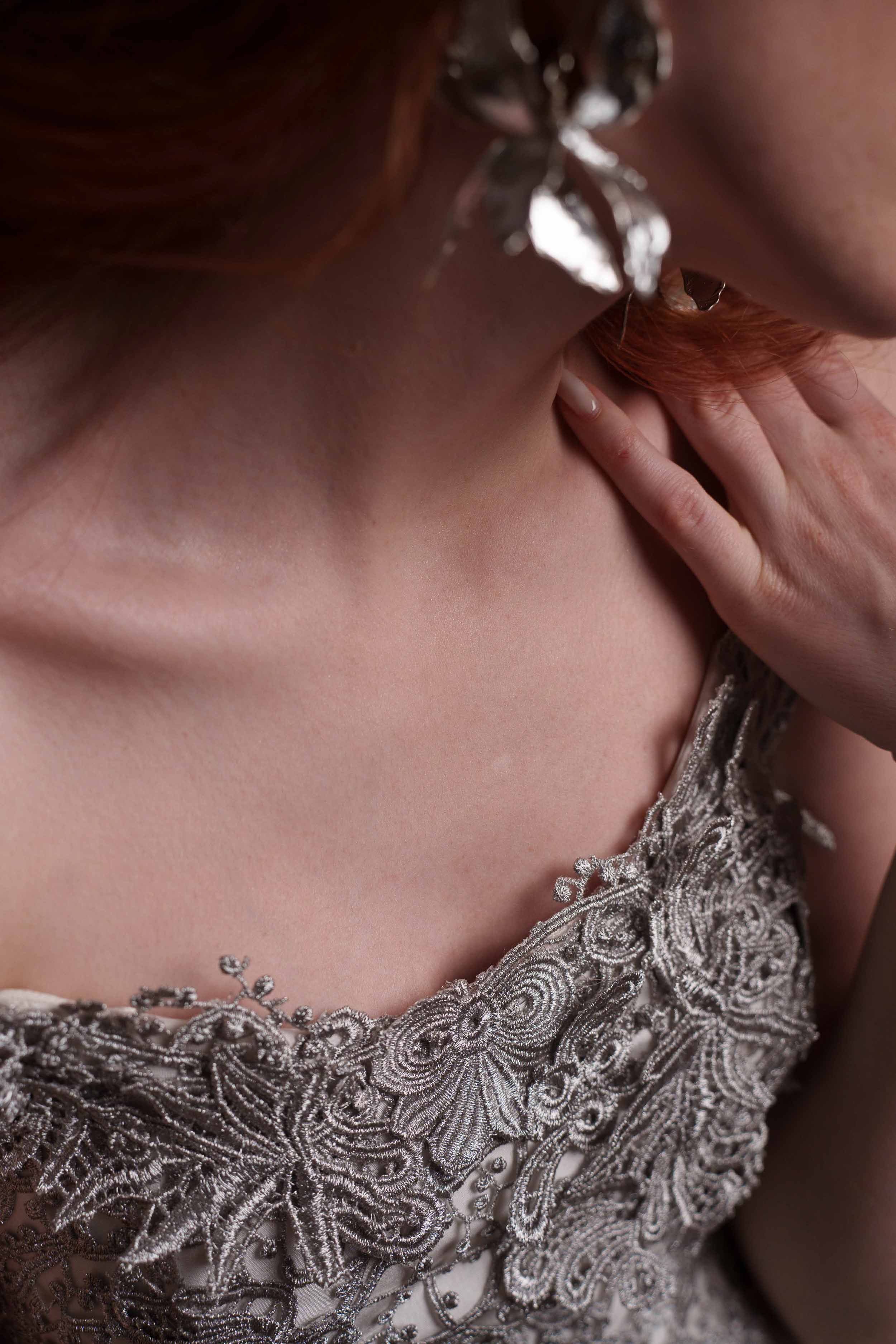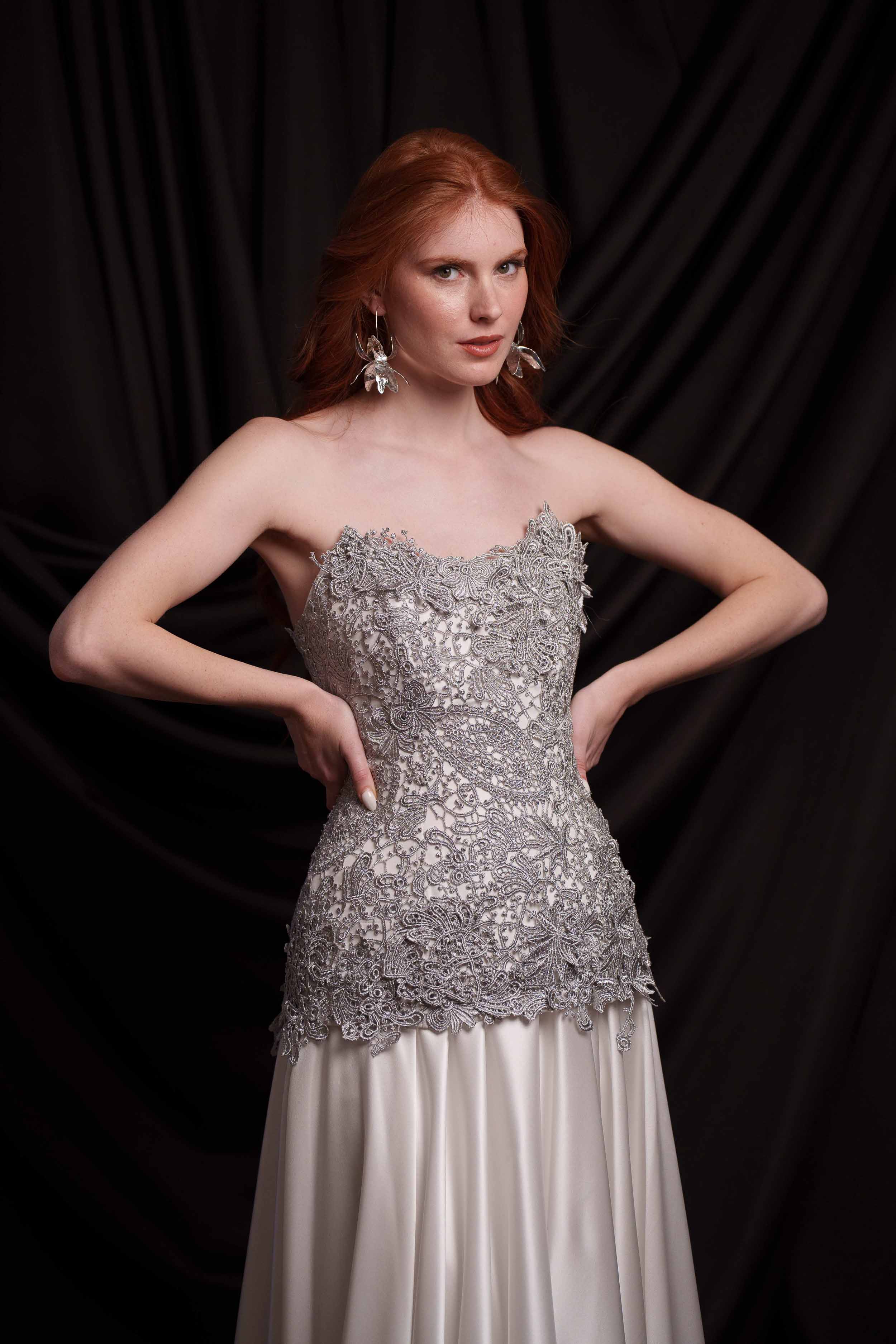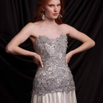 Текстуриран корсет, който подчертава женските извивки със силно изразено вталяване. Украсен е с ръчно пришита сребърна дантела.