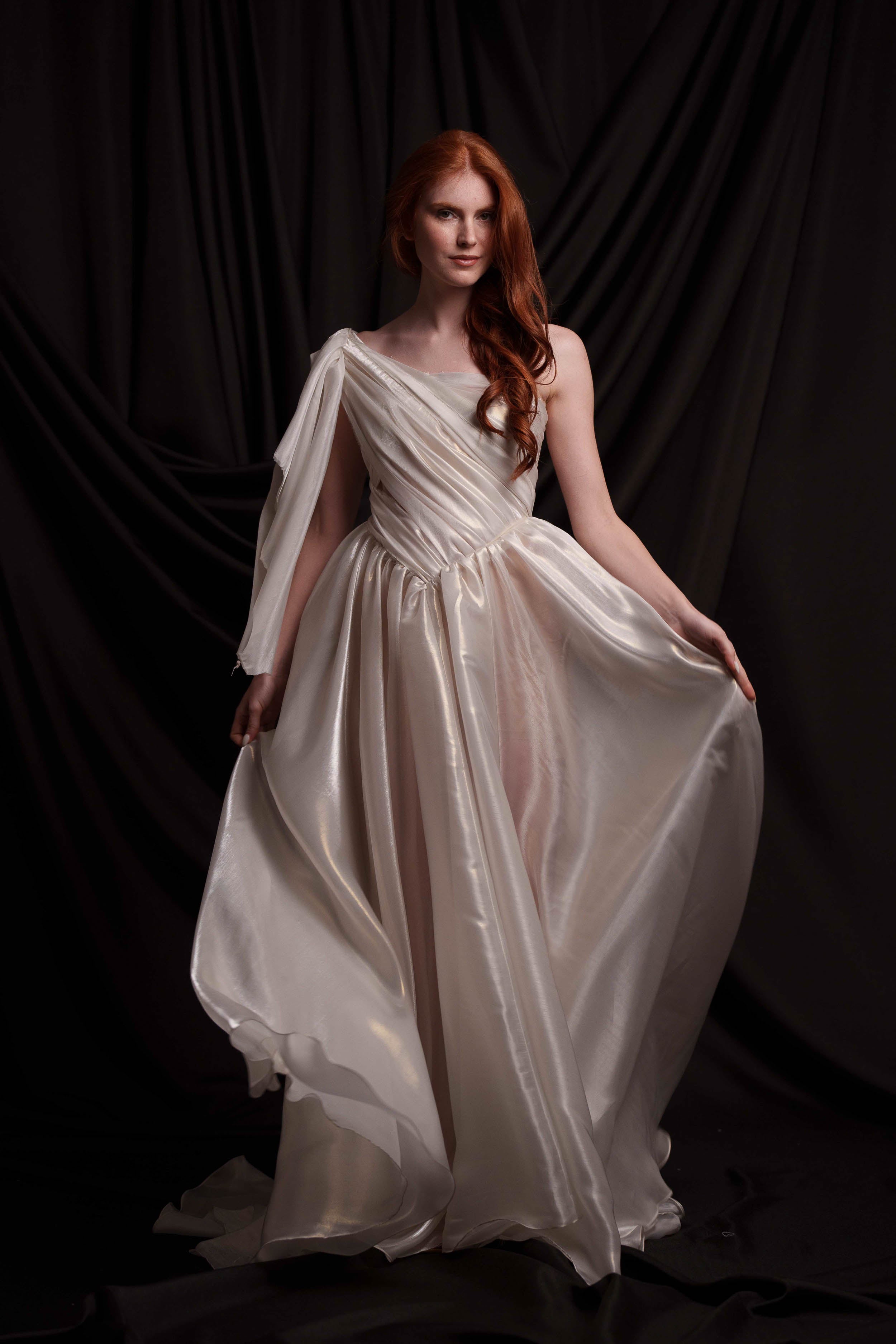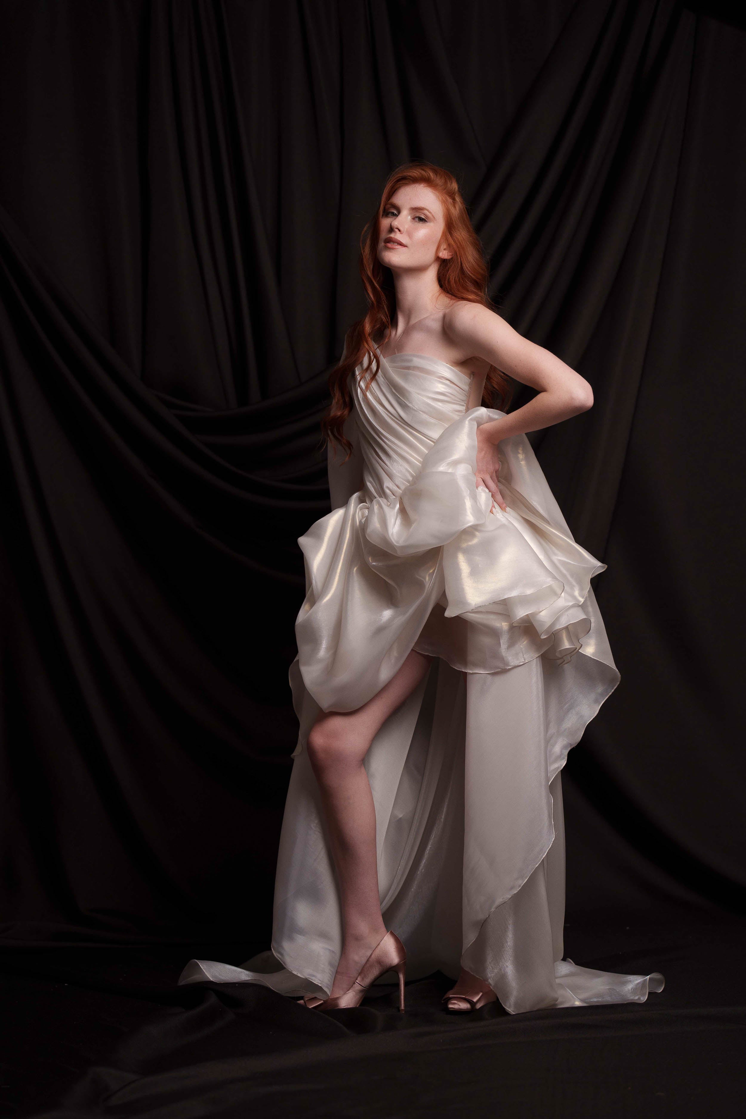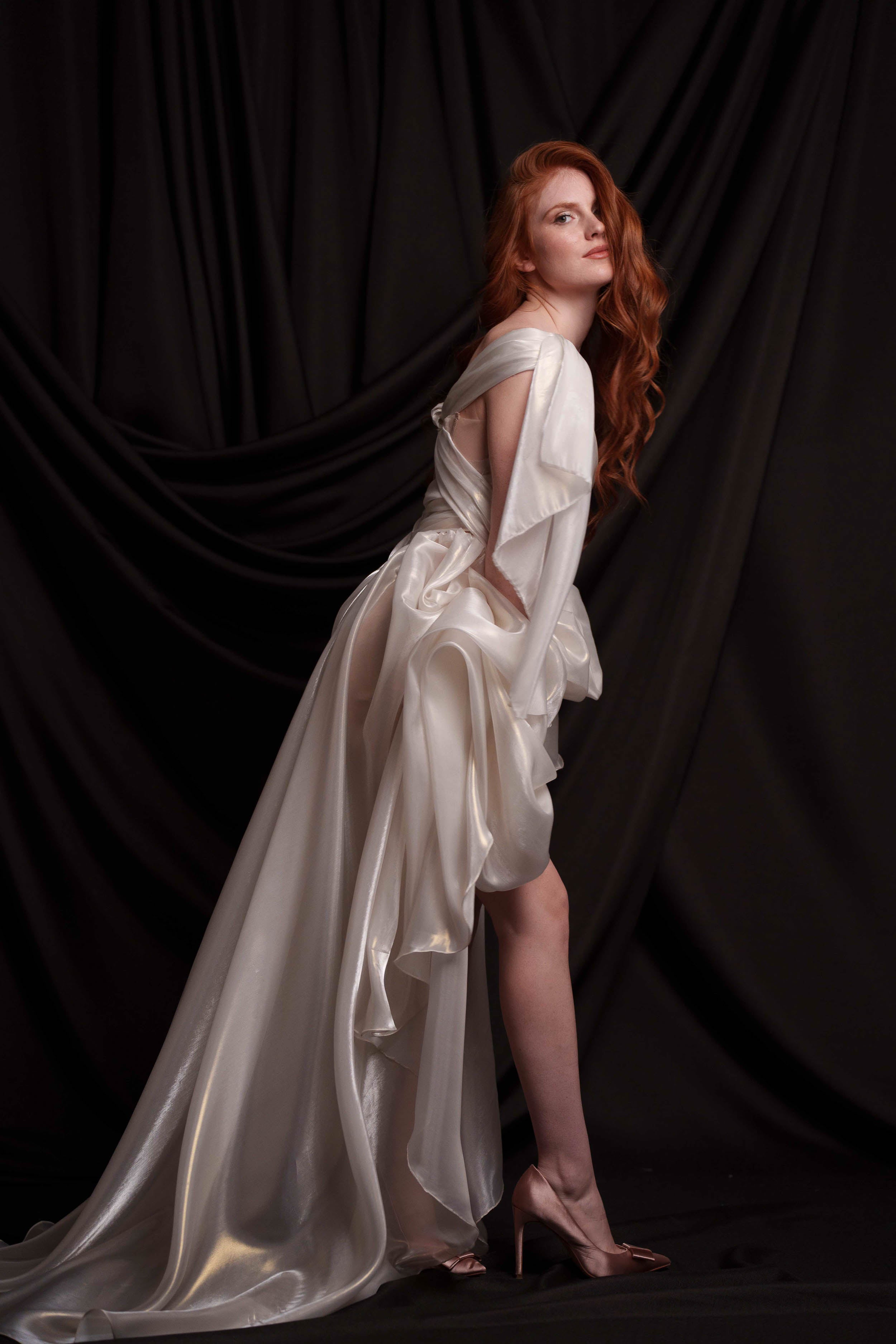Горната част е силно структуриран корсет, покрит с ръчно драпирана органза, а долната — макси „веревна“ пола, която може да се моделира в различни форми.