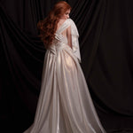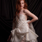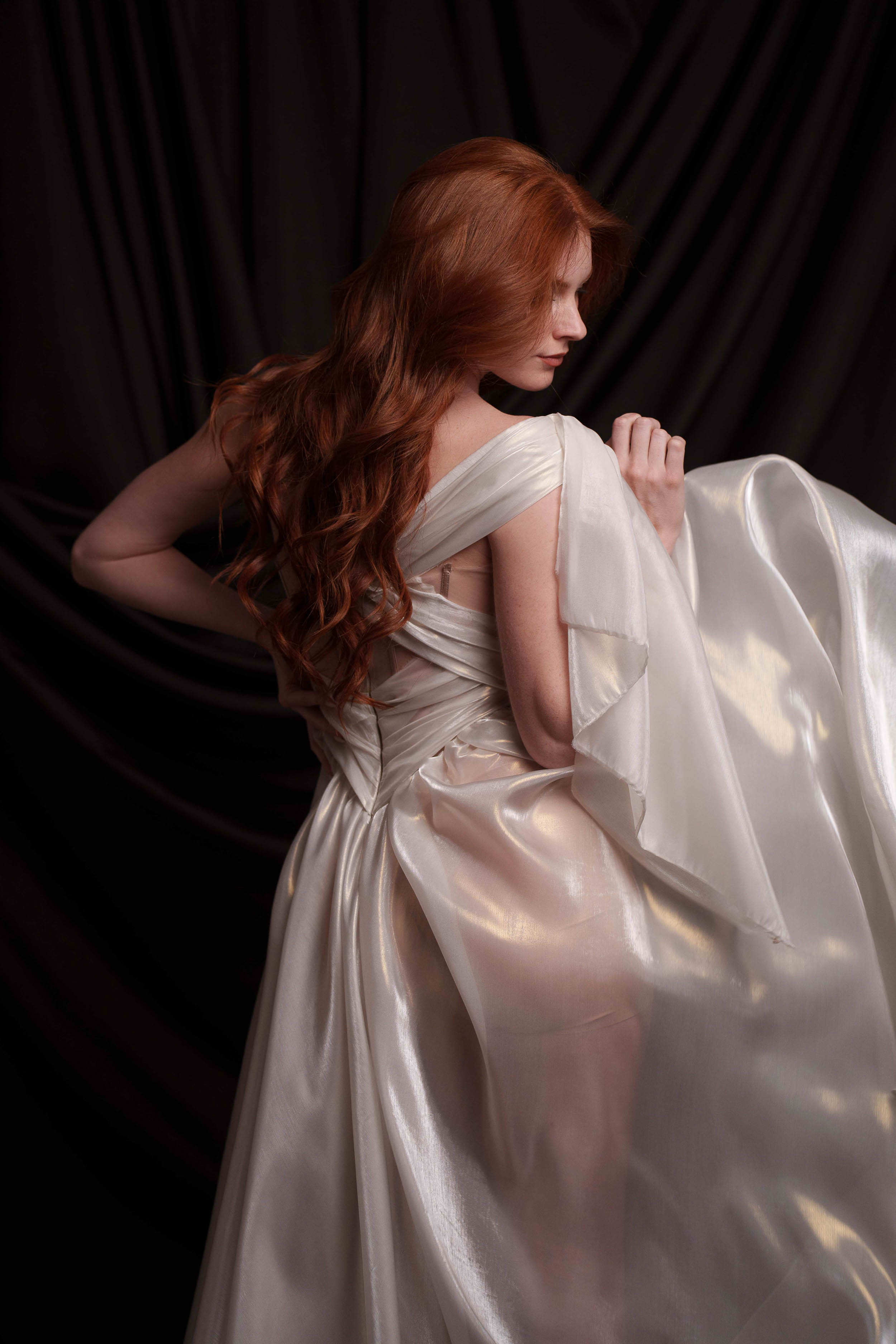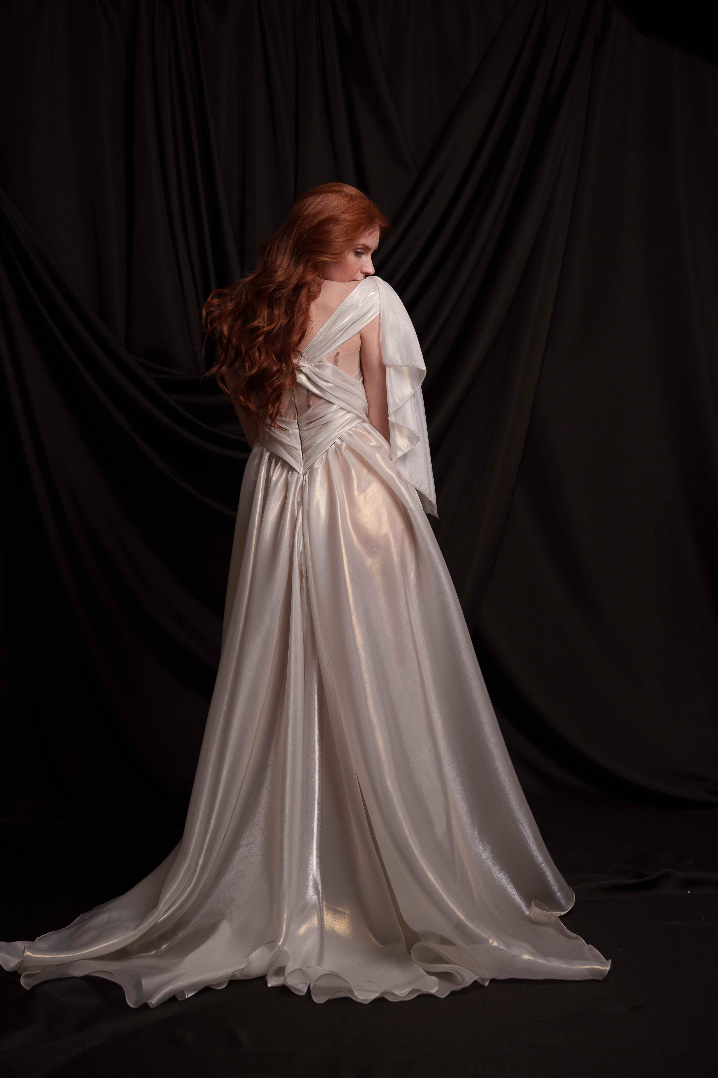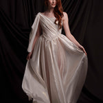 Изключително лека сватбена рокля от „течна“ органза в блестящ екрю нюанс с деликатни розови и шоколадови отблясъци.