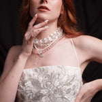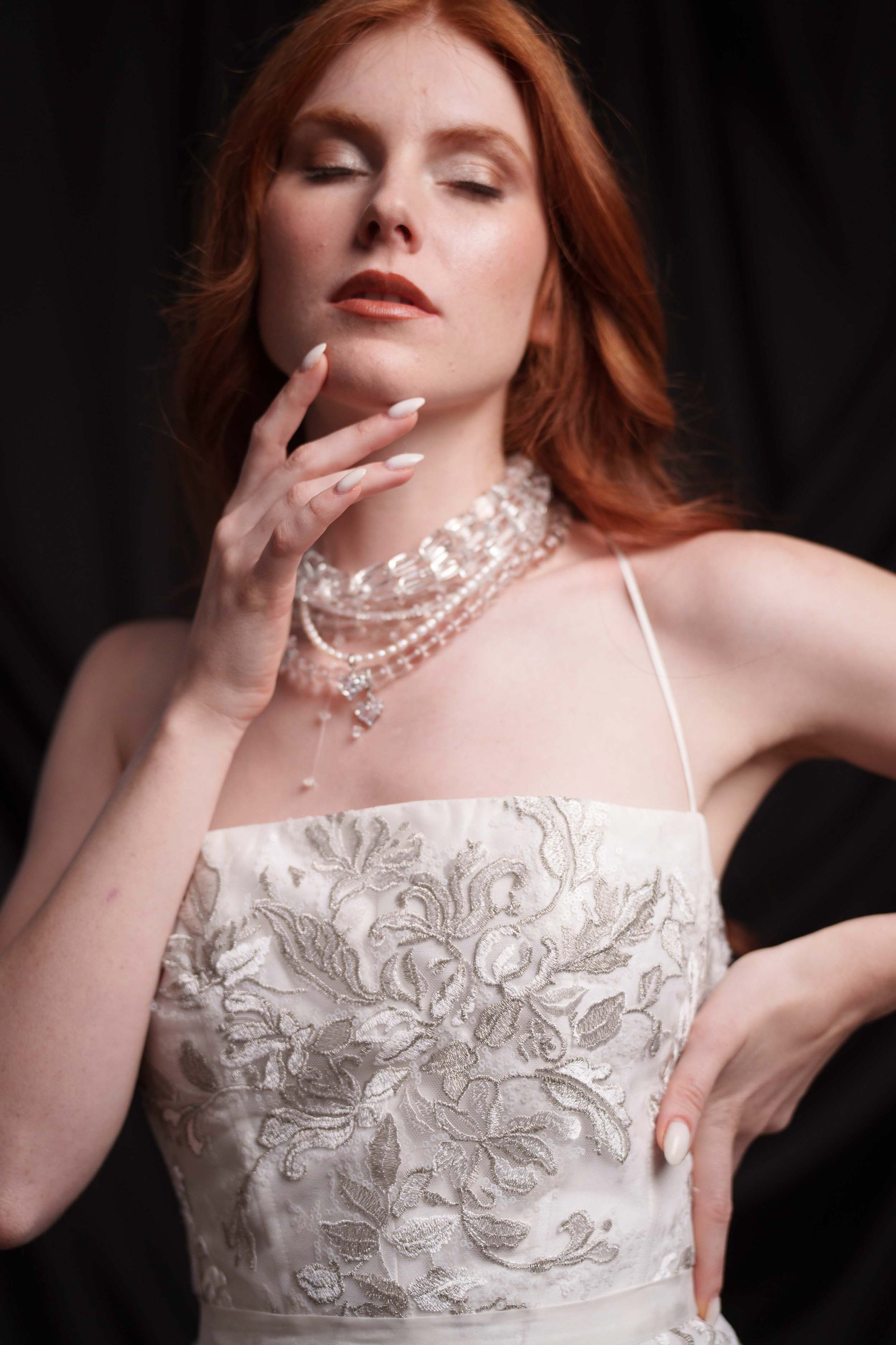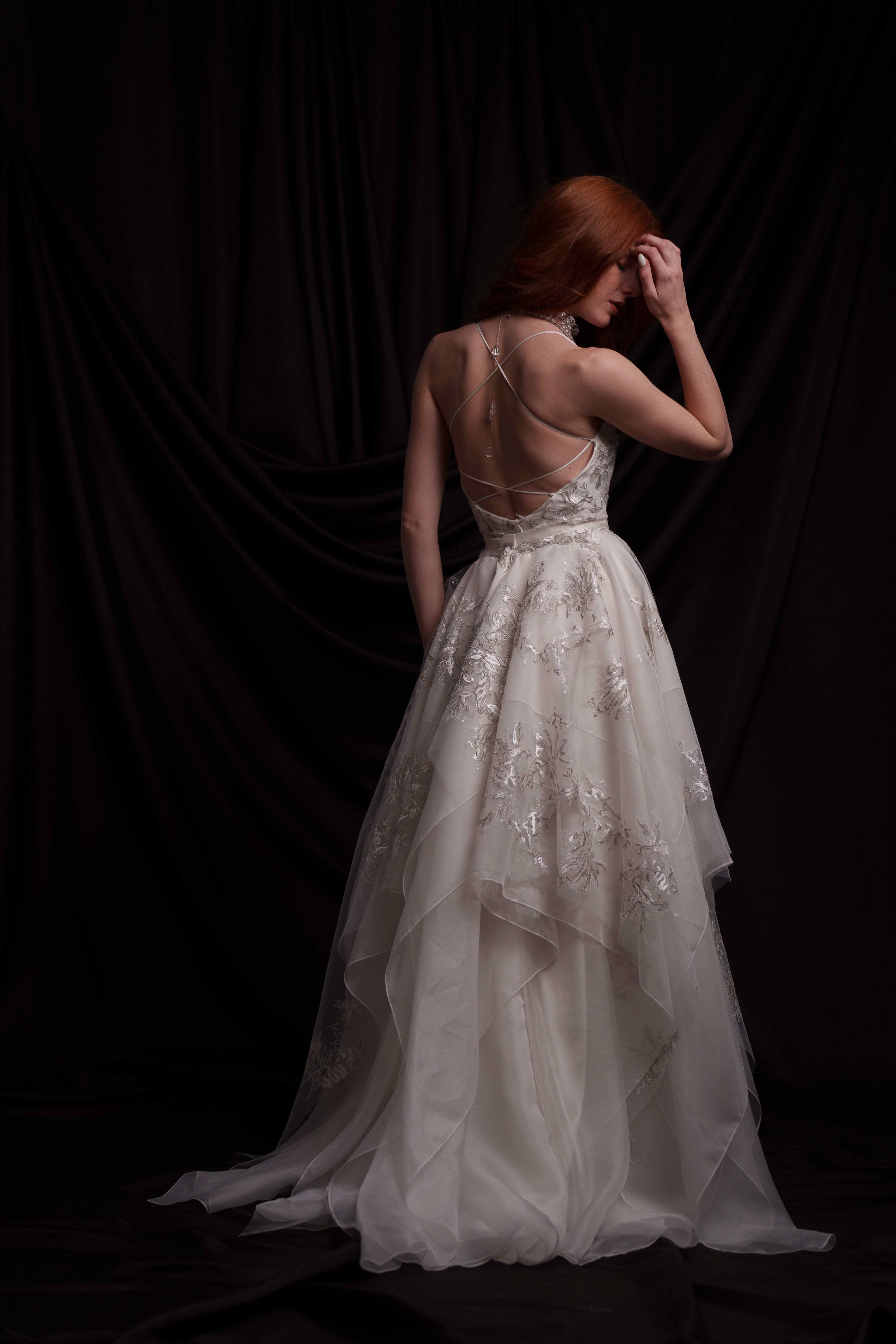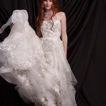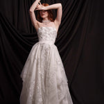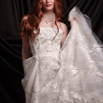 Сватбен сет от две части. Изключително лека, етажирана пола, създадена от фина копринена органза в меко перлено бяло, покрита с Японска абстрактна бродерия в няколко нюанса на сиво и сребърно. Съчетана е с ръчно бродиран корсет от копринен шантунг.