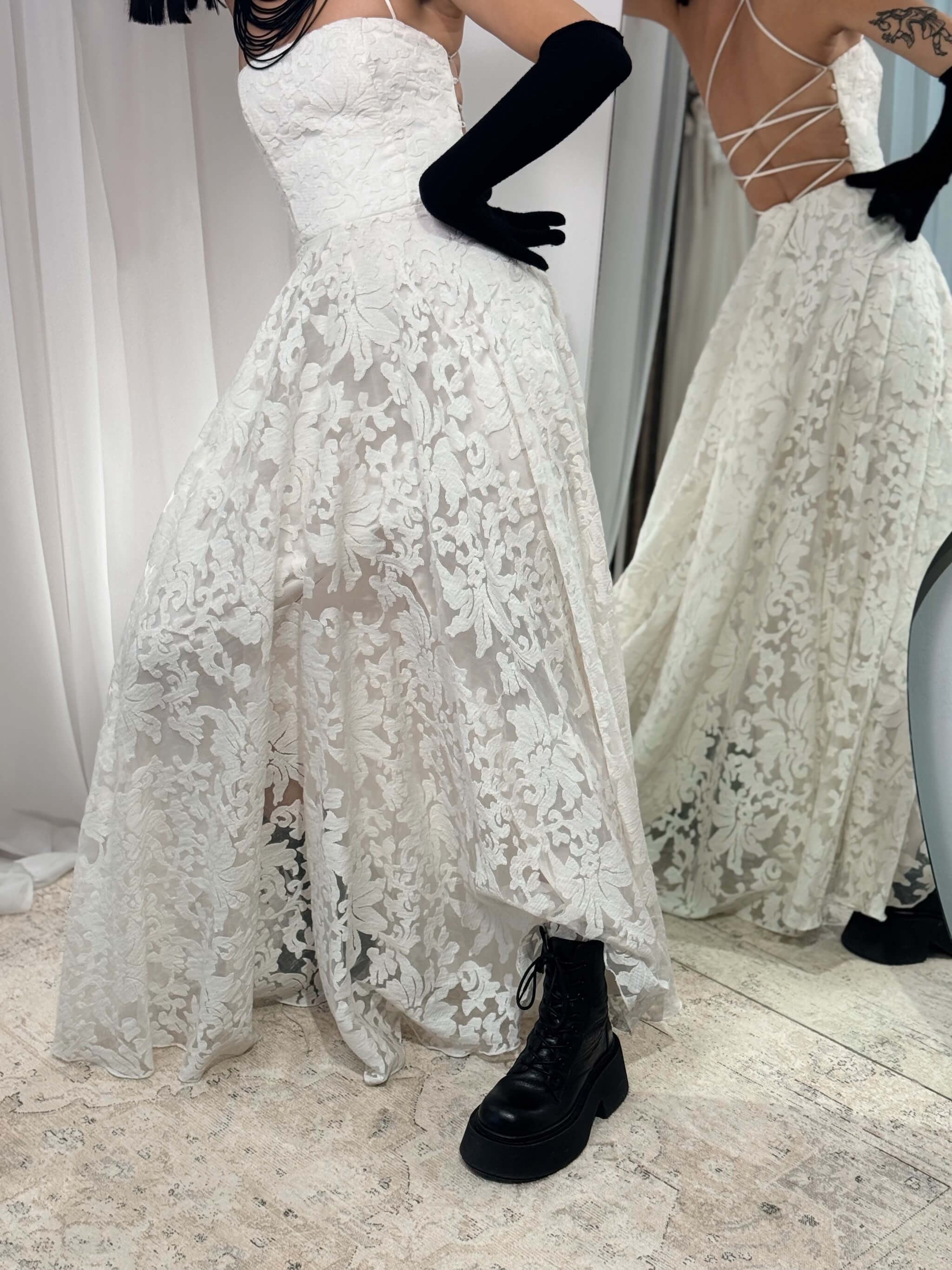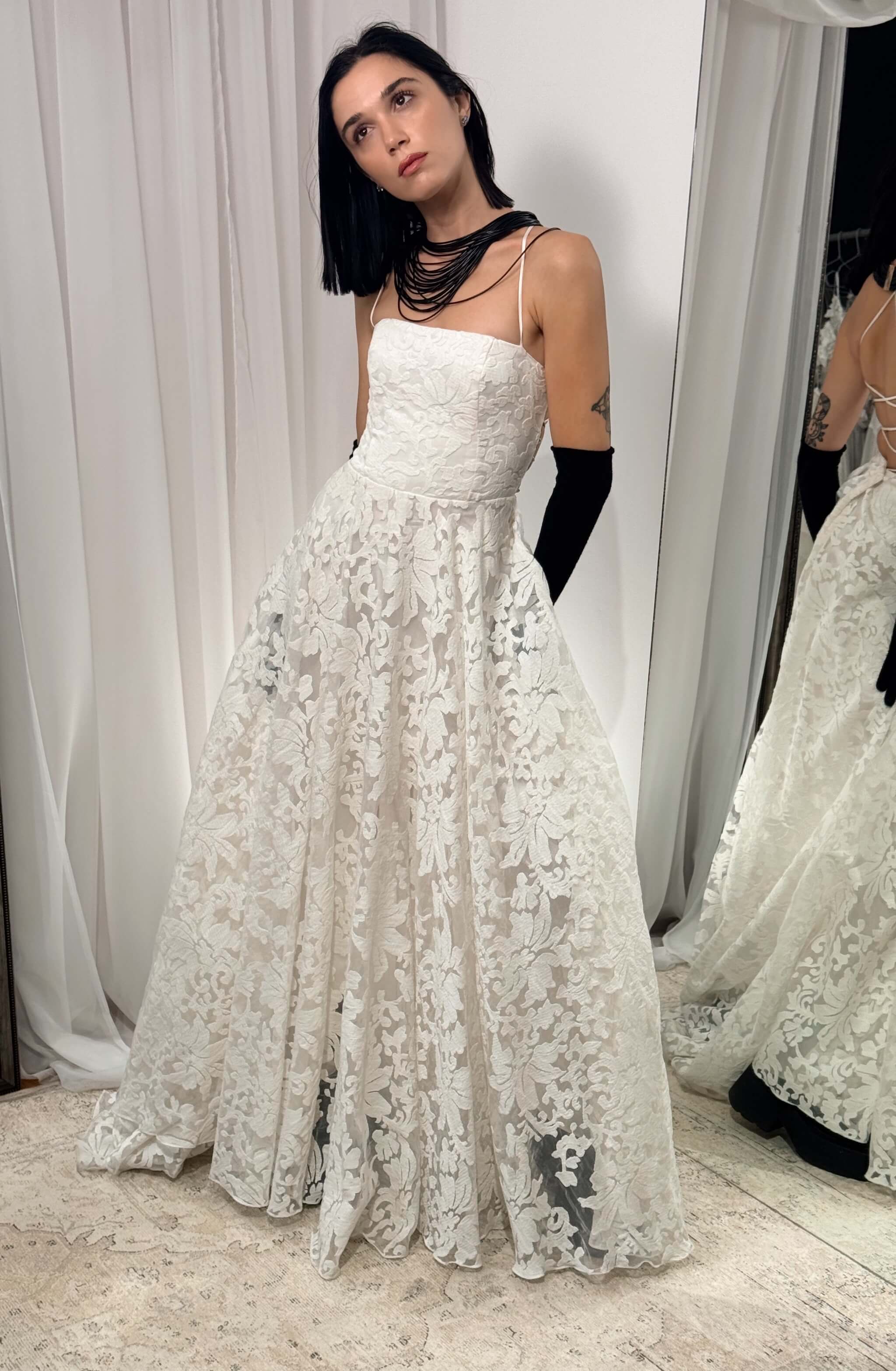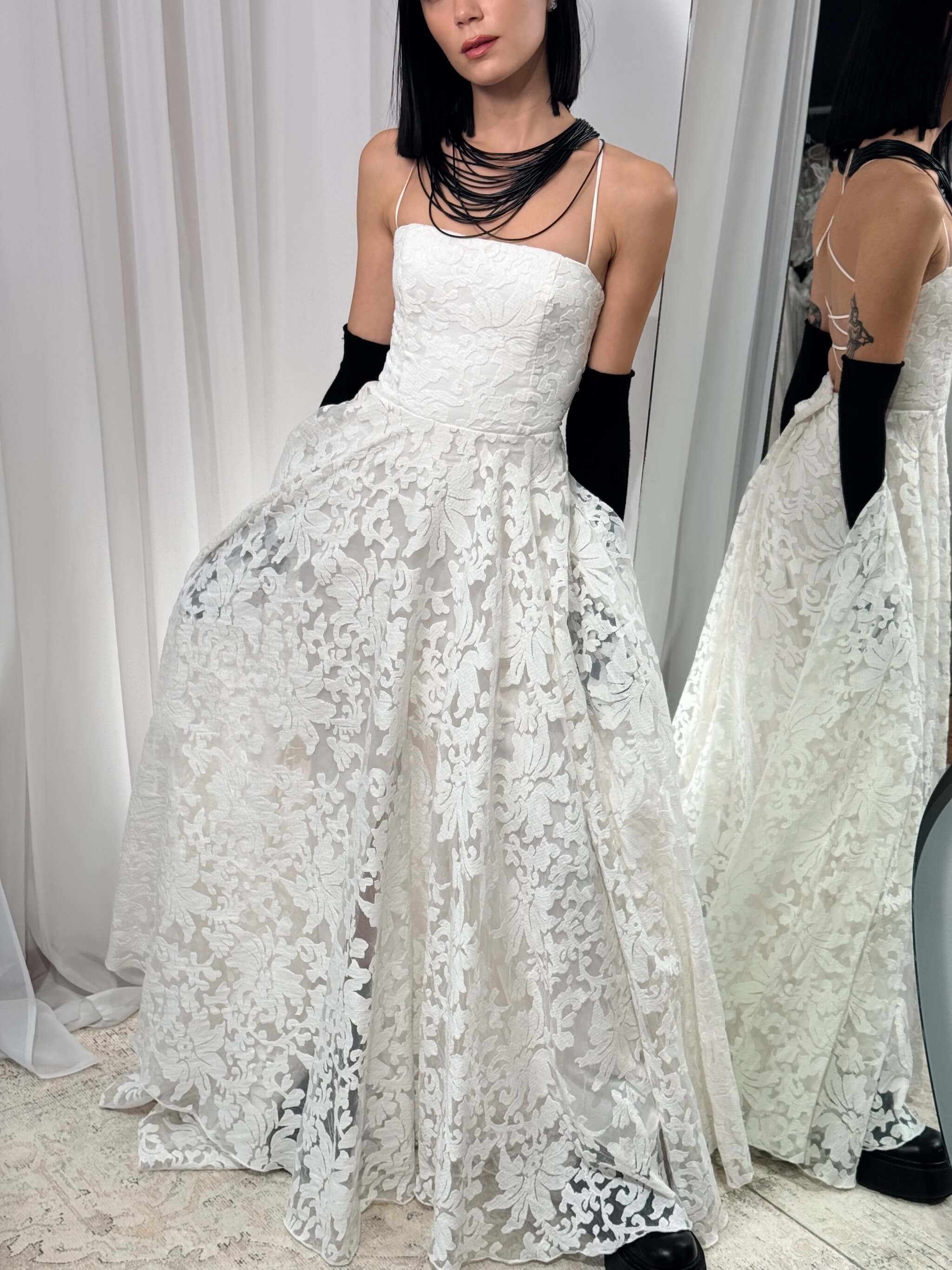 A cotton embroidered A-line gown with a daring open back - ready to transform with your styling. Make her romantic. Make her punk. Make her yours.
