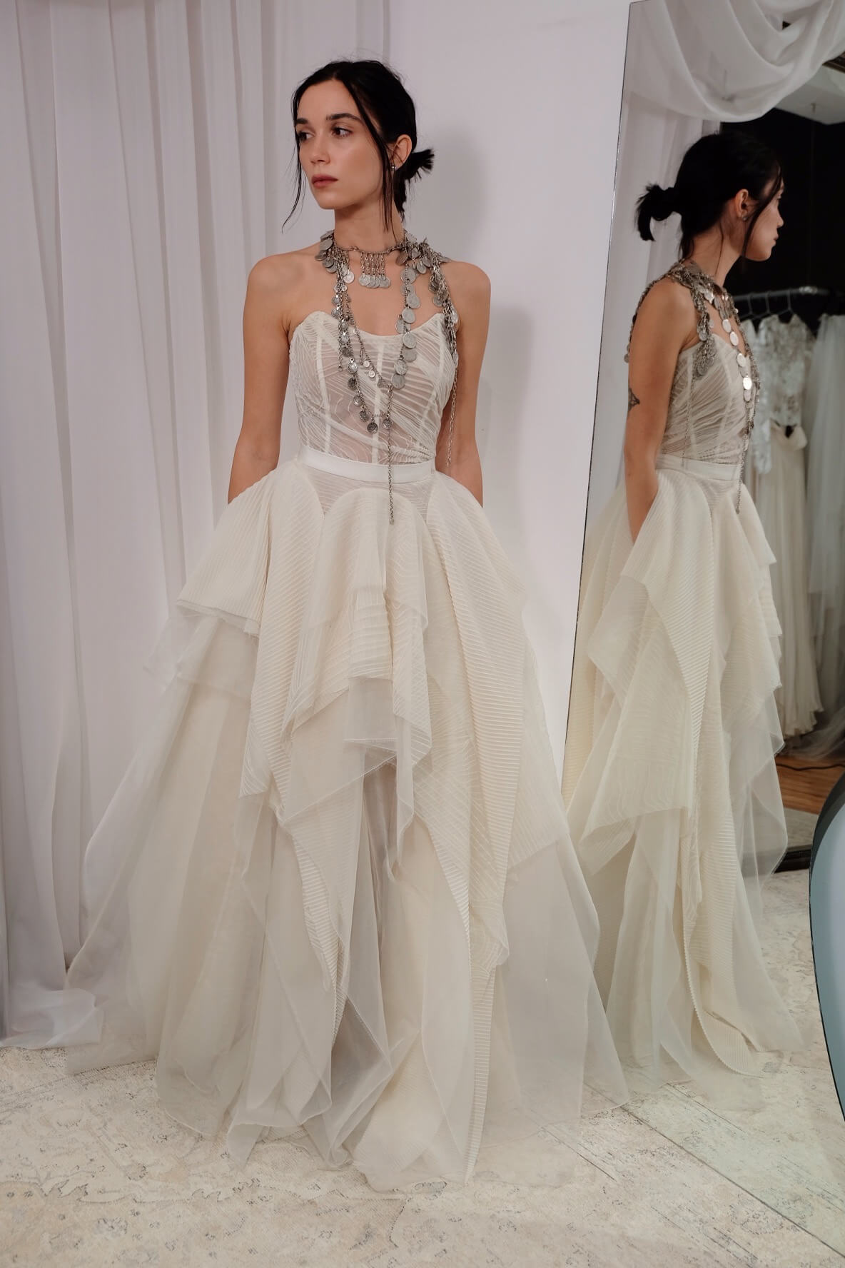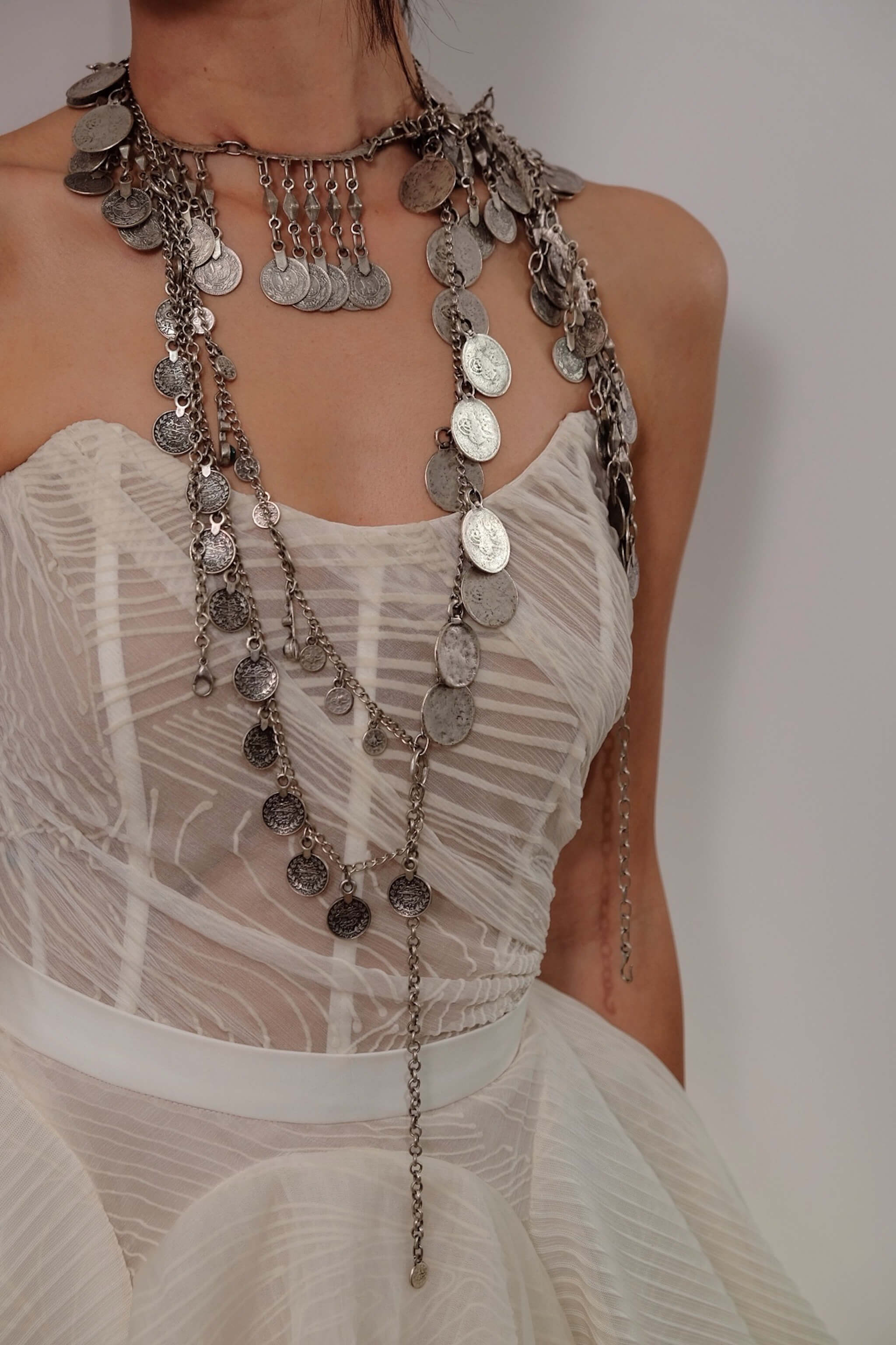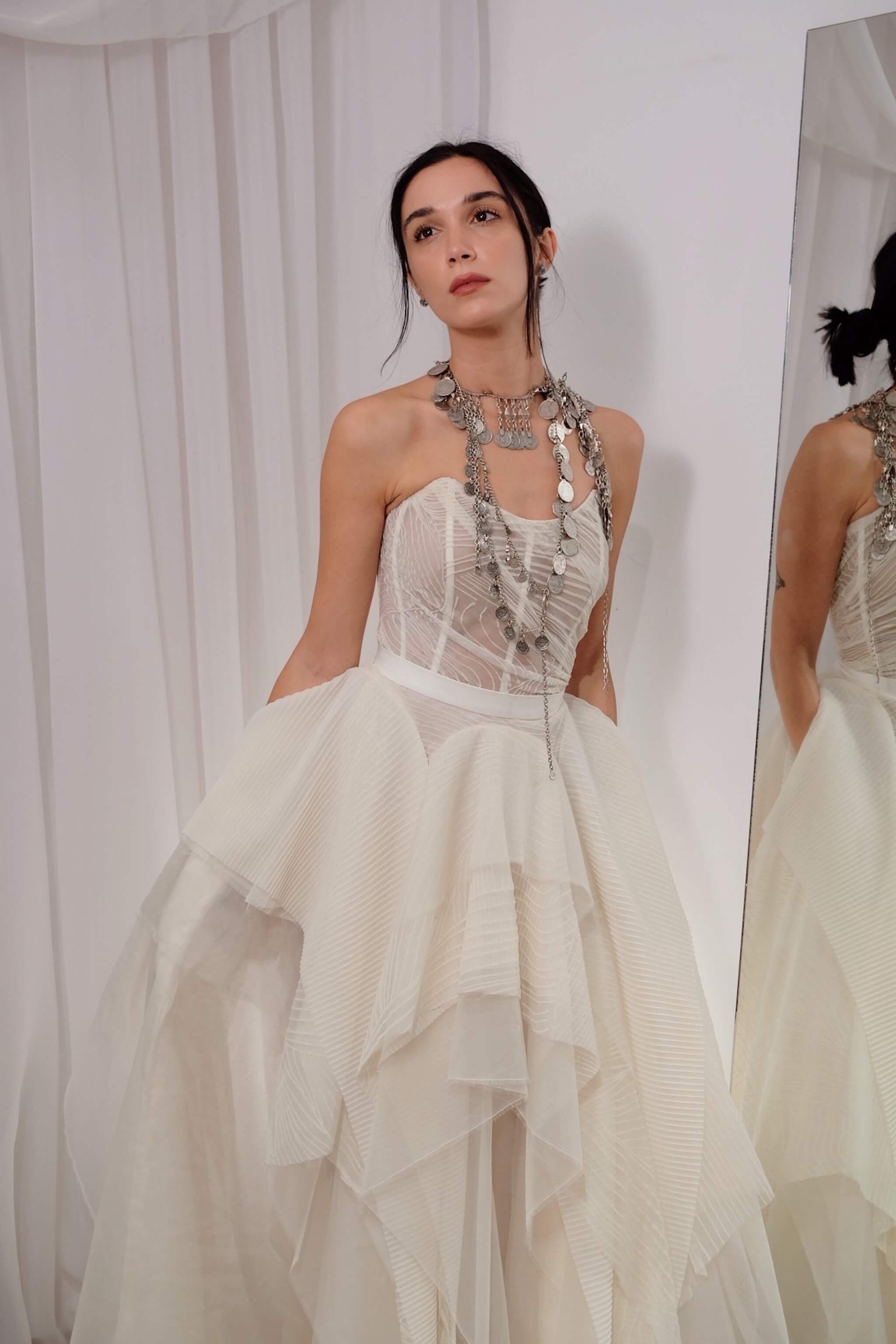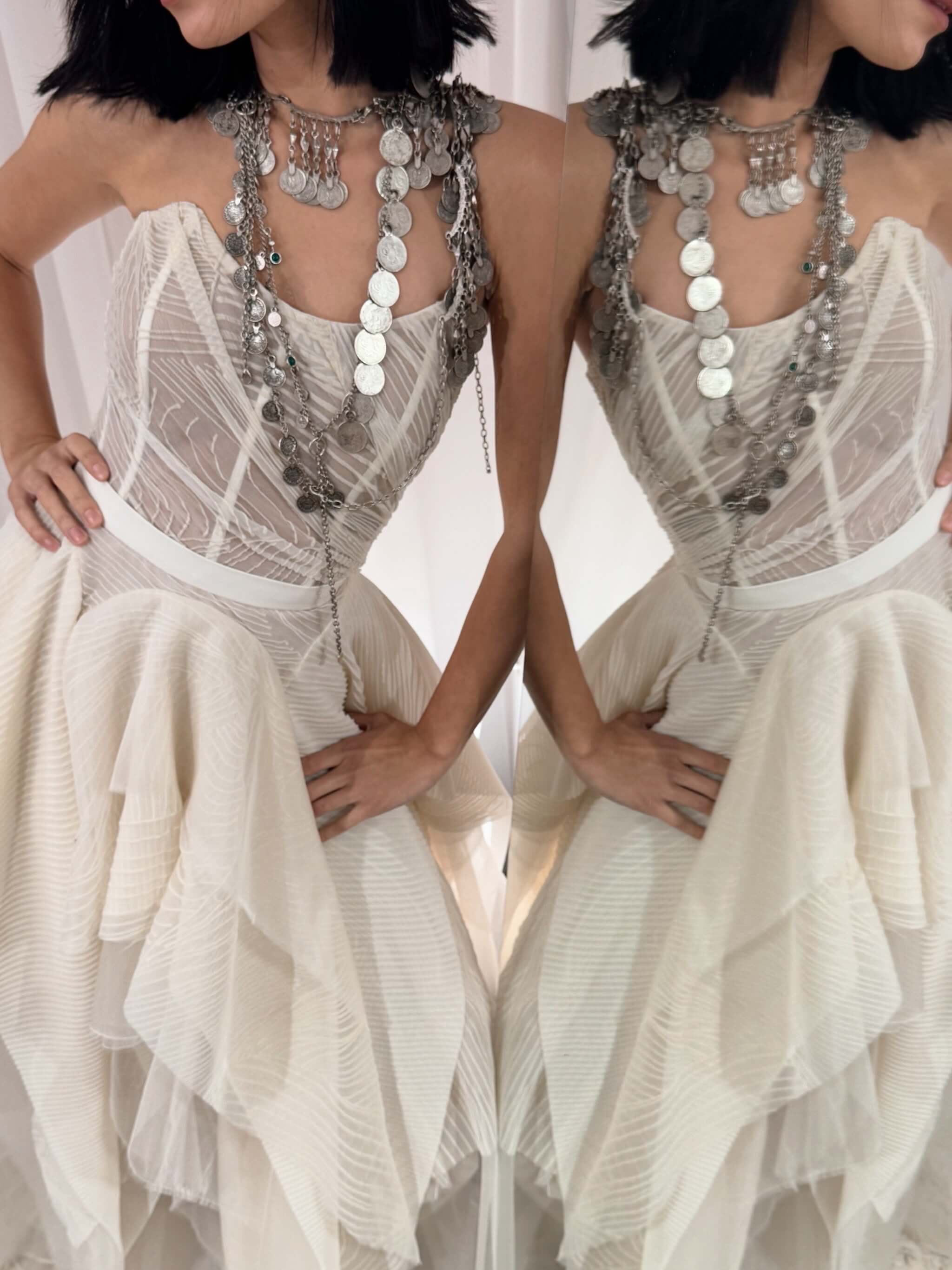 Unique geometric embroidery, textured organza and tulle maxi skirt, topped with a sheer structured bodice.