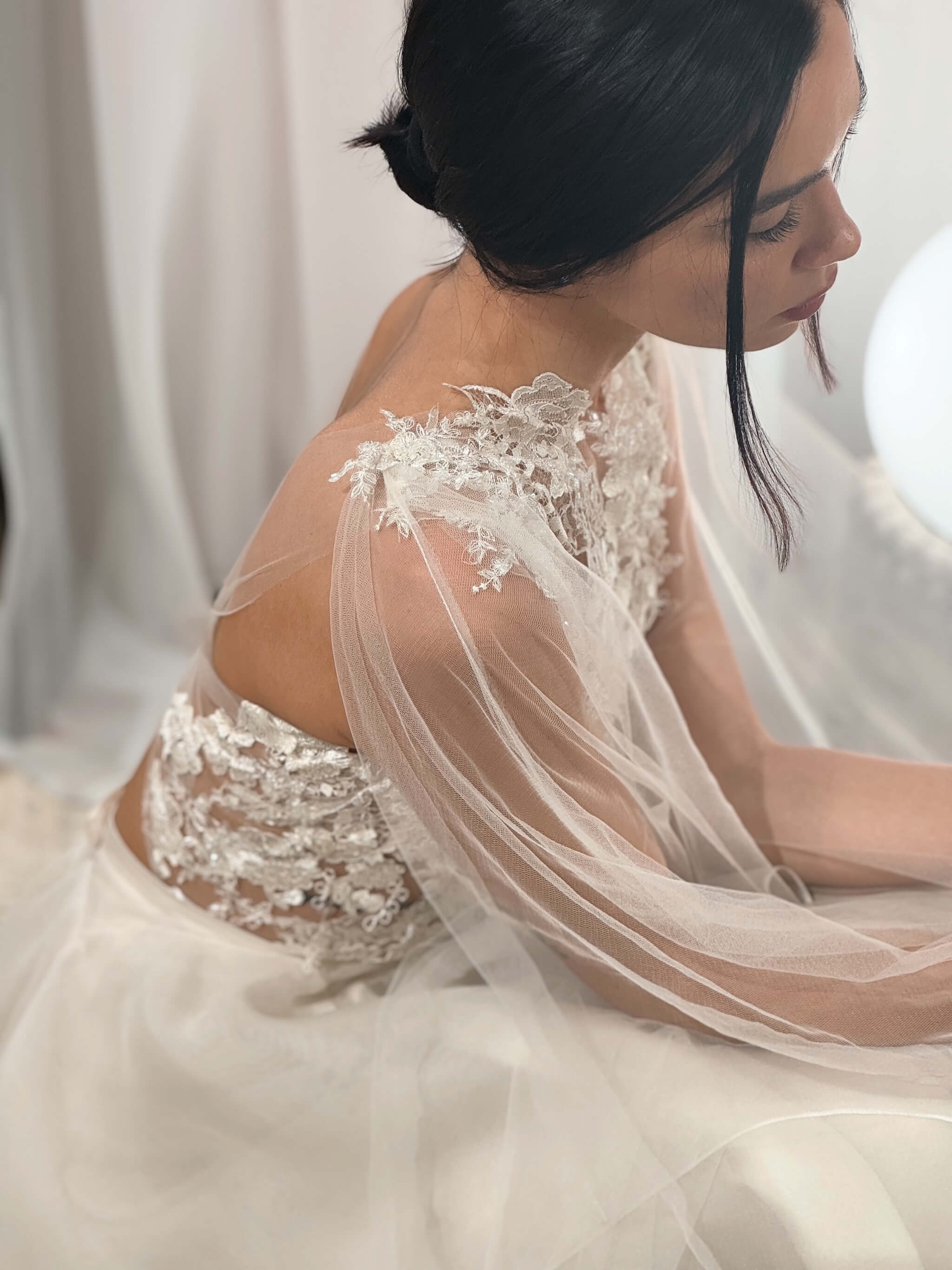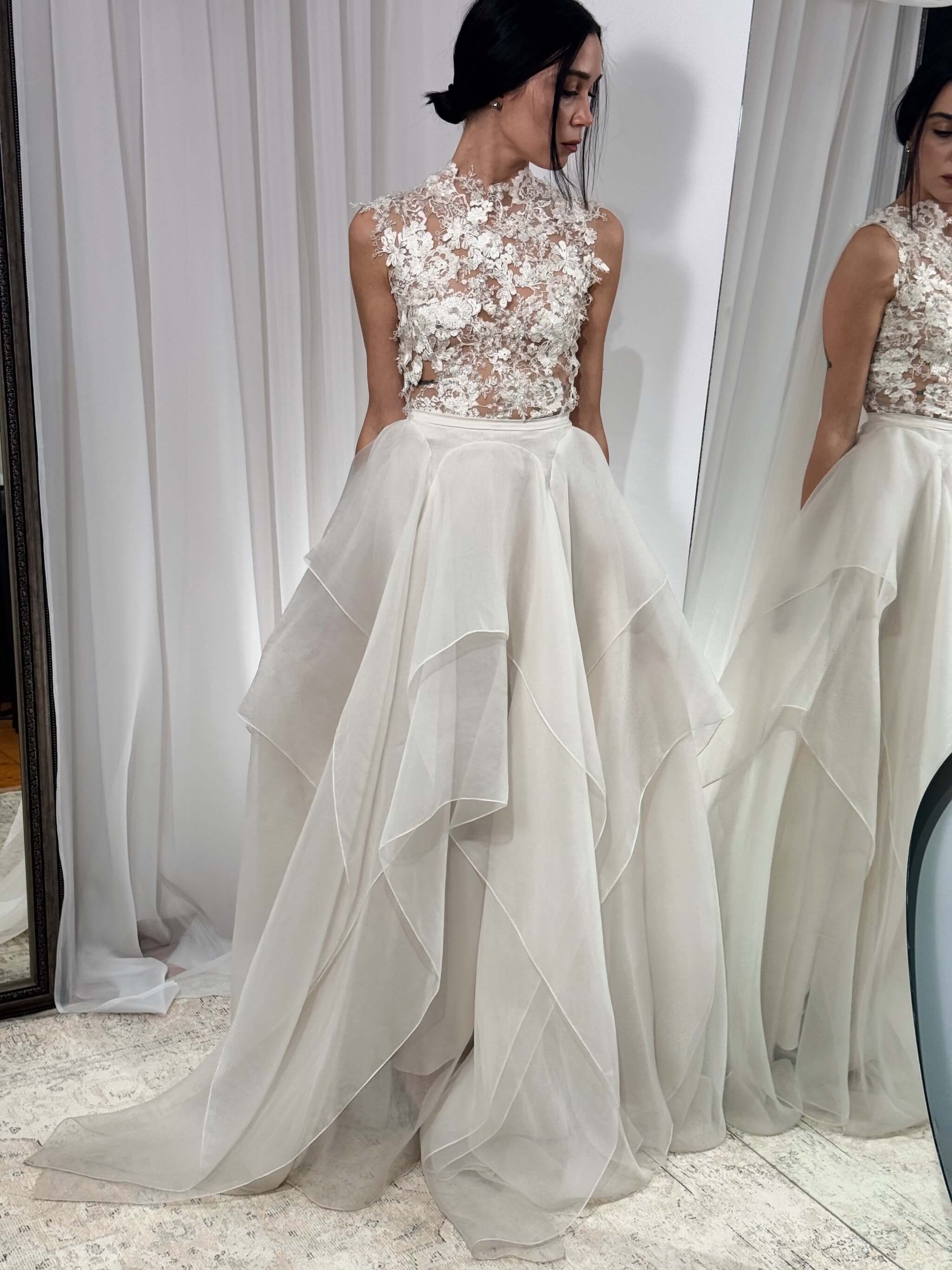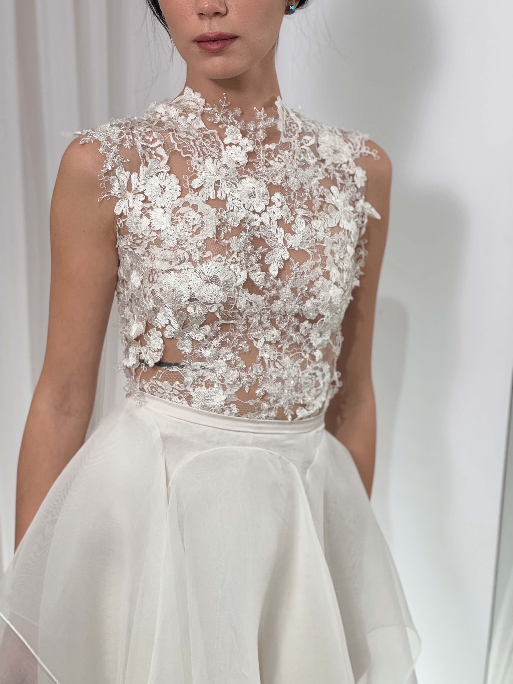 A two-piece set — full skirt of the lightest silk organza in creamy ivory, paired with an illusion tulle top hand-embellished with three types of lace and crystal beads.