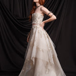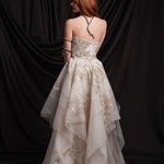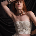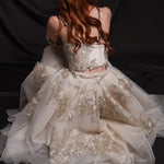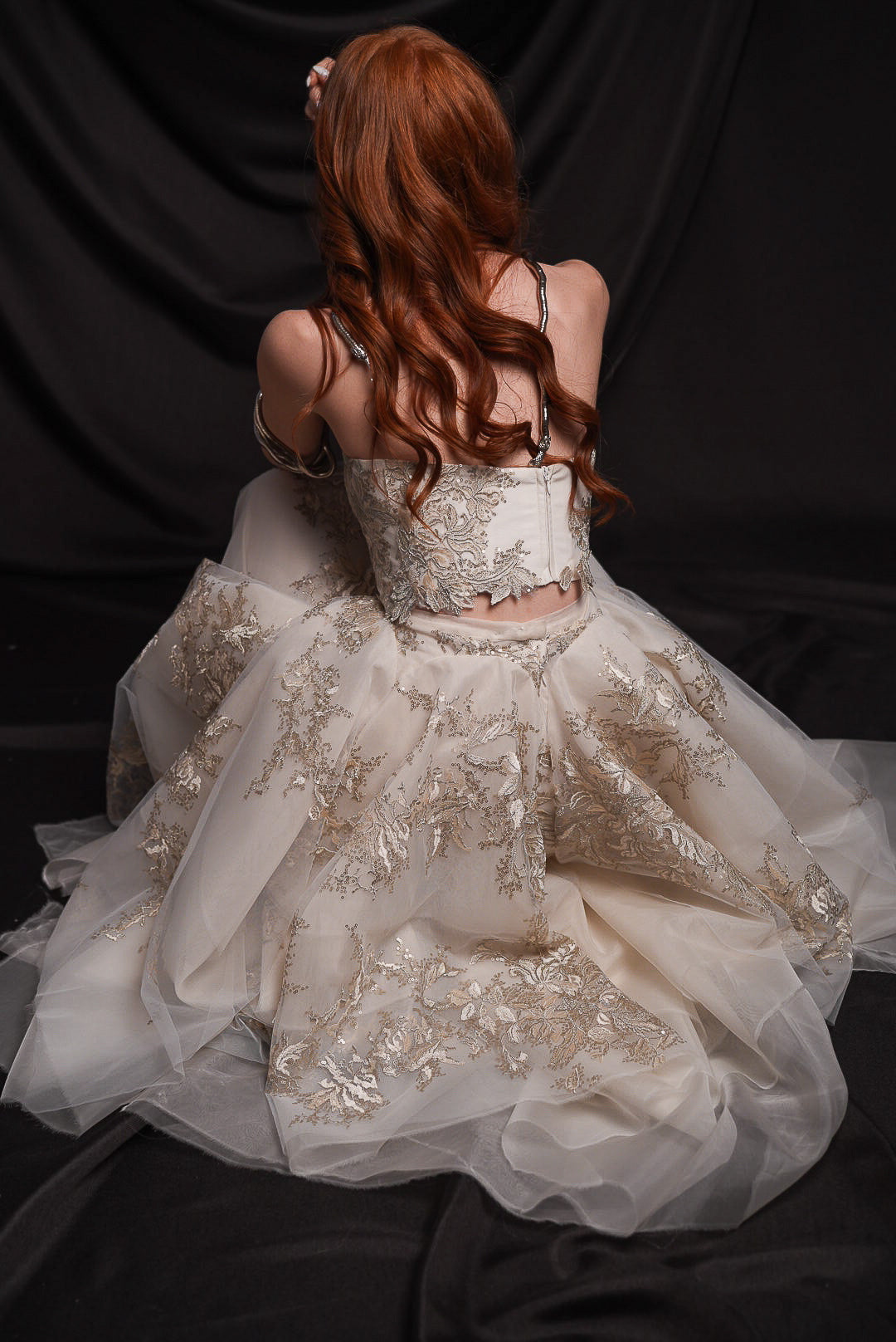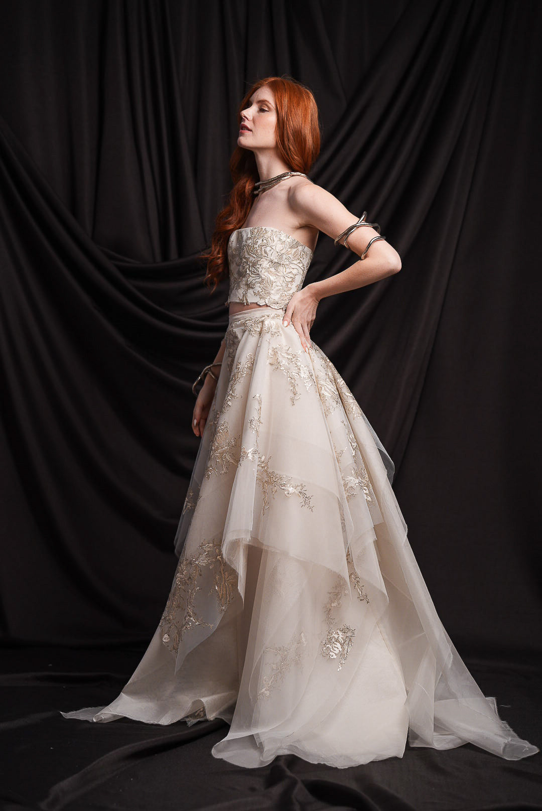 A unique two-piece bridal set, covered in hand-drawn abstract embroidery in multiple shades of gold, finished with fine clear sequins for an incredible, subtle shine.