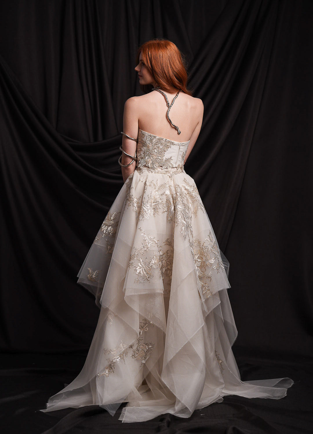 The skirt is an architectural statement—built to create shape and texture. Crafted from pure ivory silk organza, Japanese-inspired embroidery spills asymmetrically to the sides, emphasizing the silhouette and the form. It is paired with a semi-cropped corset that defines and accentuates the waist, richly embellished to complete the look.
