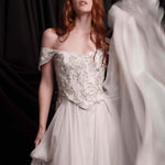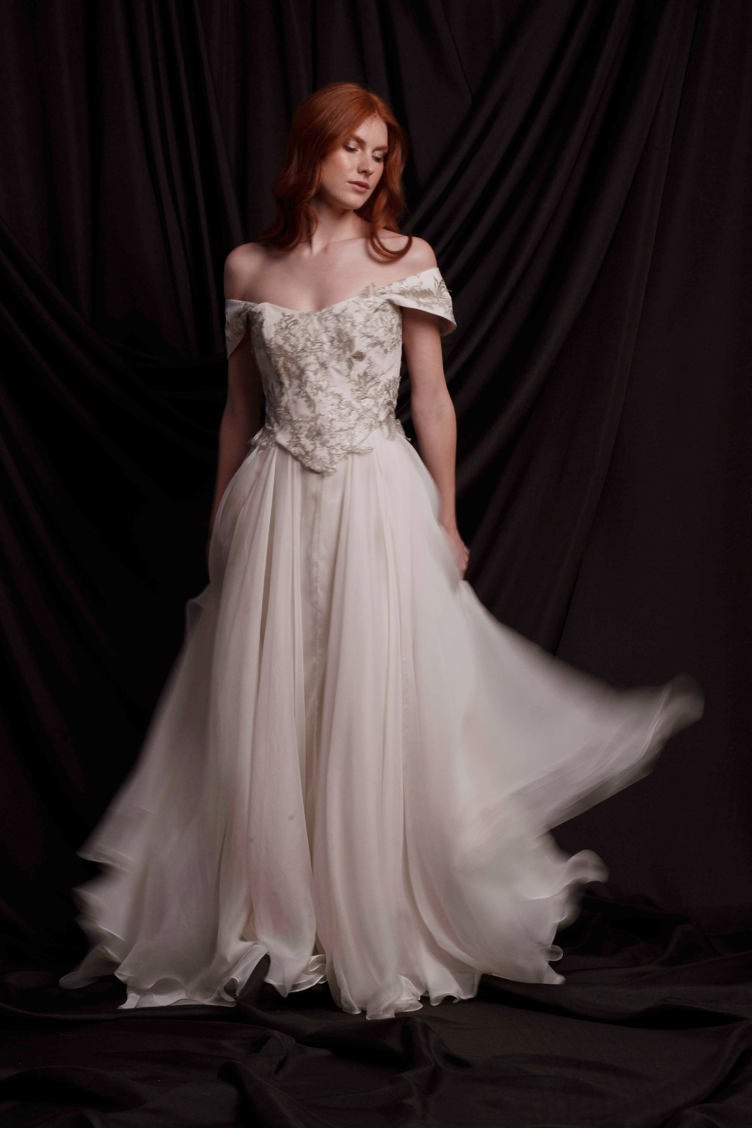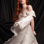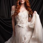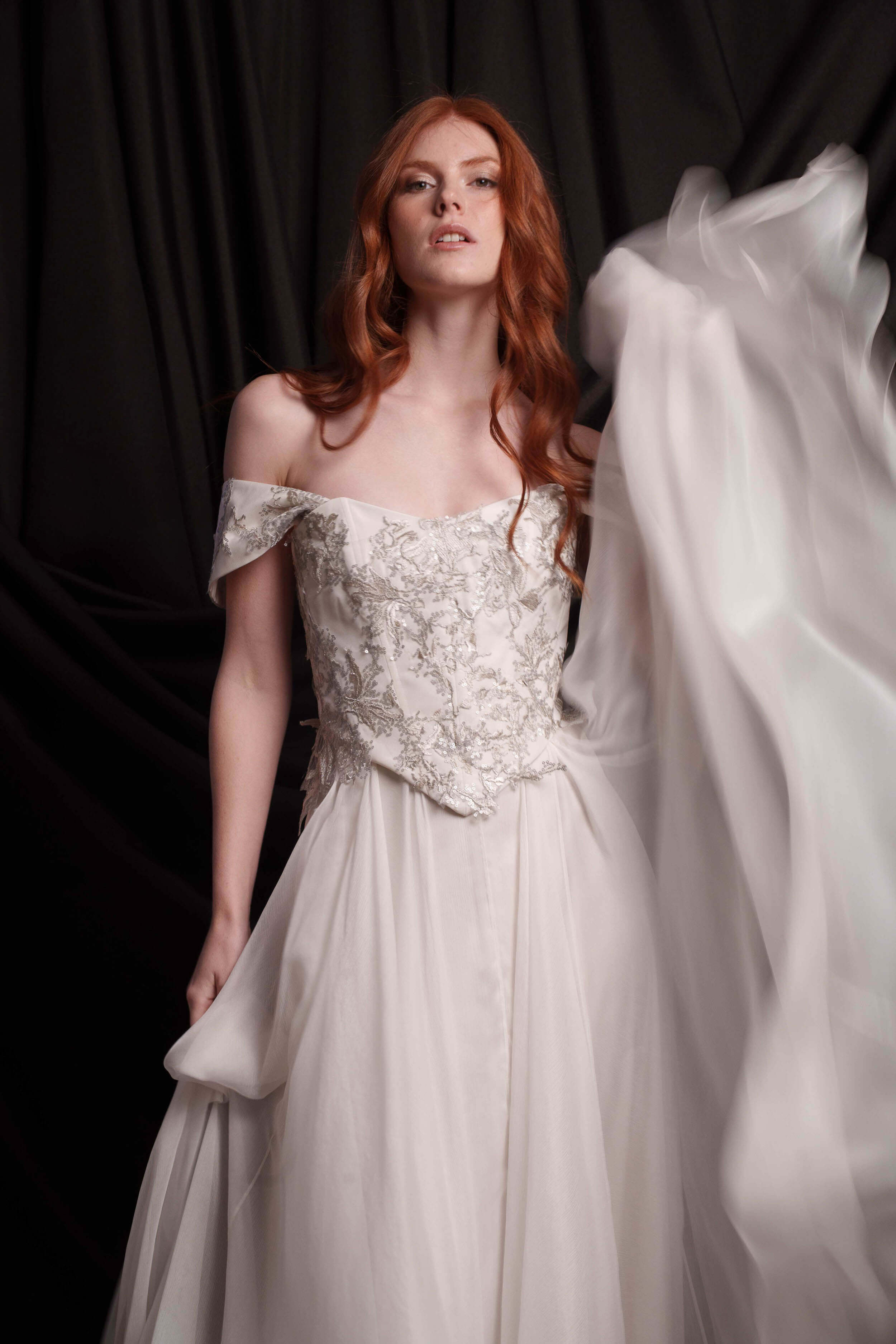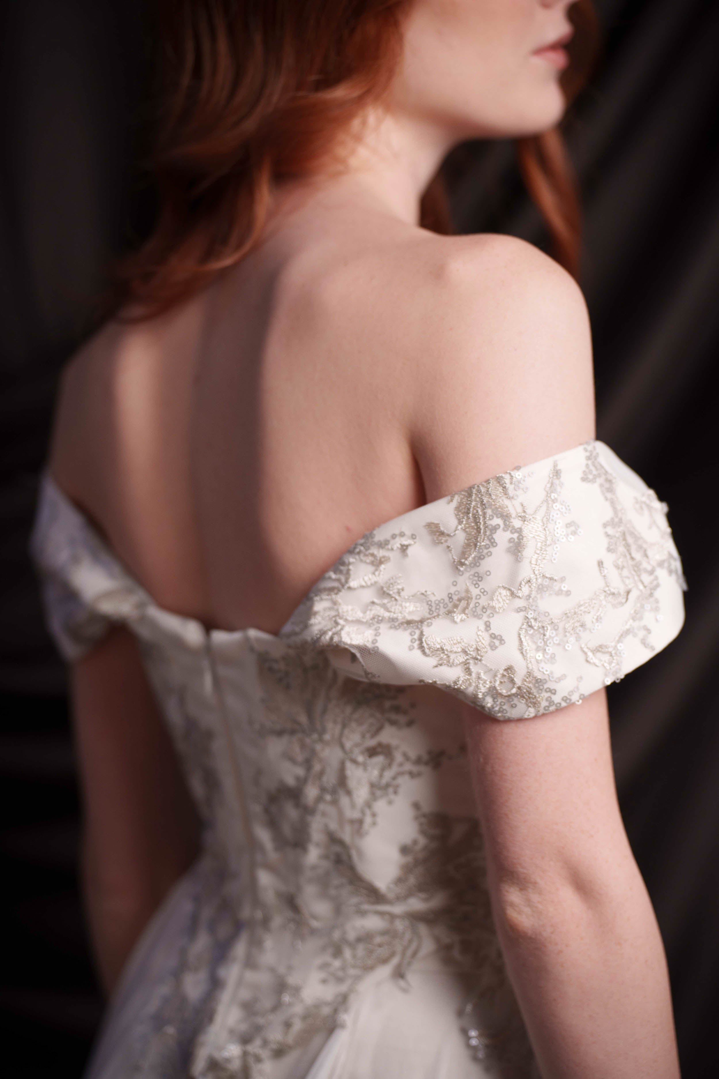 Idriss is a basque-waist corset in structured ivory silk taffeta, finished with hand-applied abstract embroidery. Off-shoulder sleeves soften the sharp silhouette and bring a feminine balance.