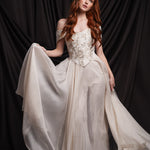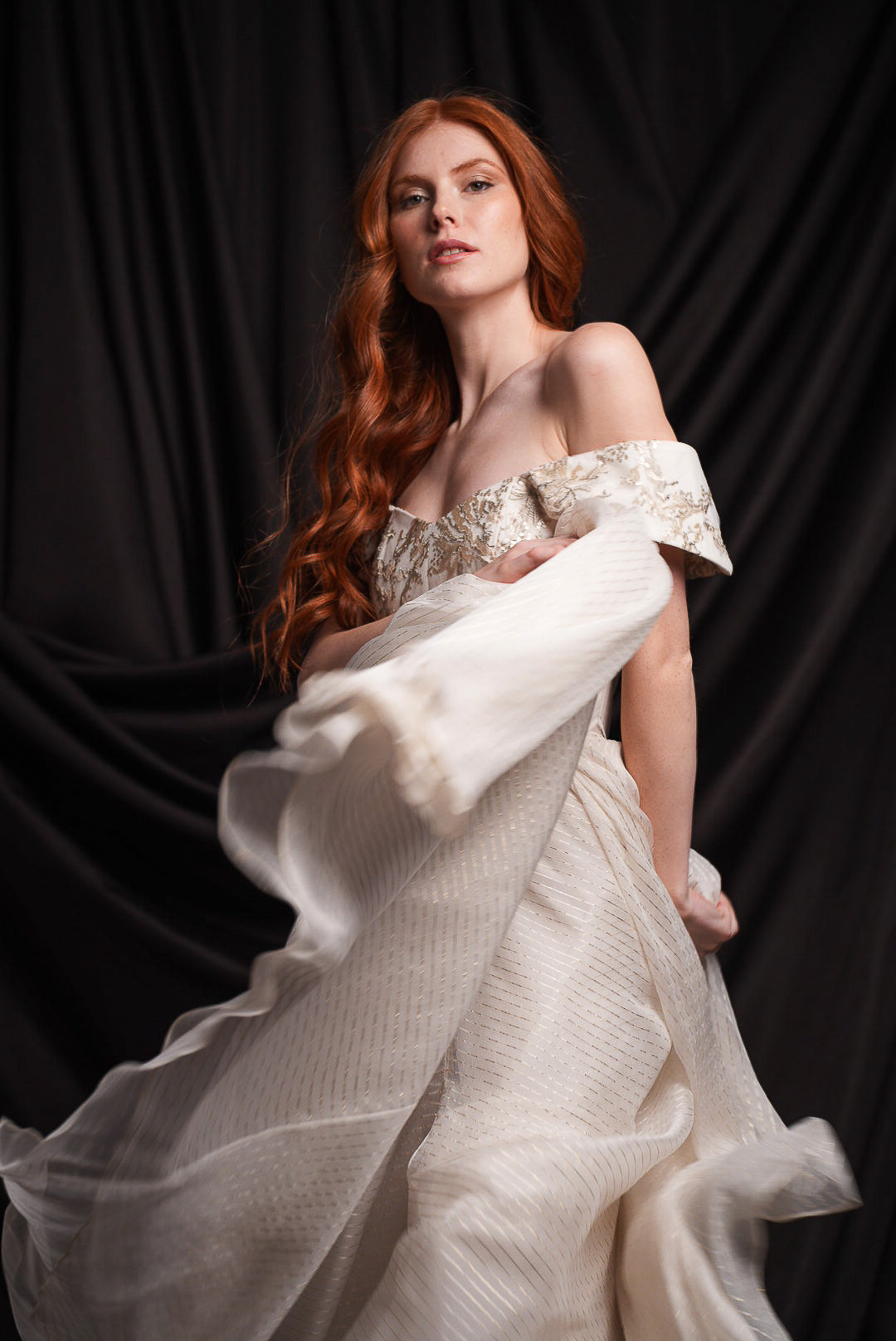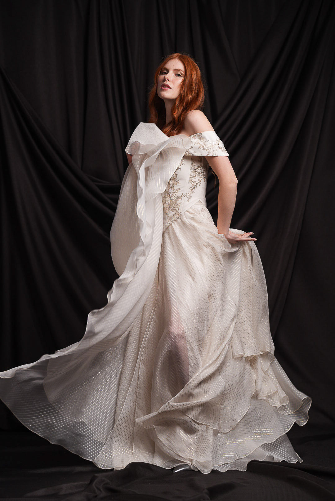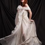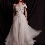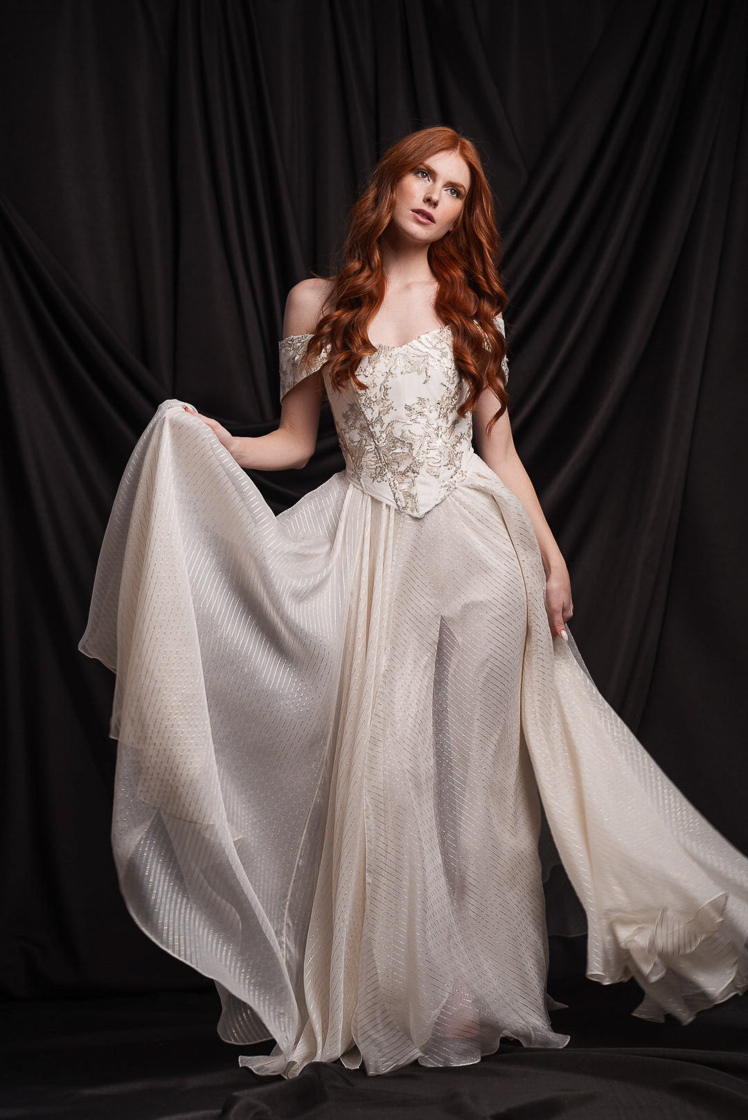 Idriss is a basque-waist corset in structured ivory silk taffeta, finished with hand-applied abstract embroidery. Off-shoulder sleeves soften the sharp silhouette and bring a feminine balance.