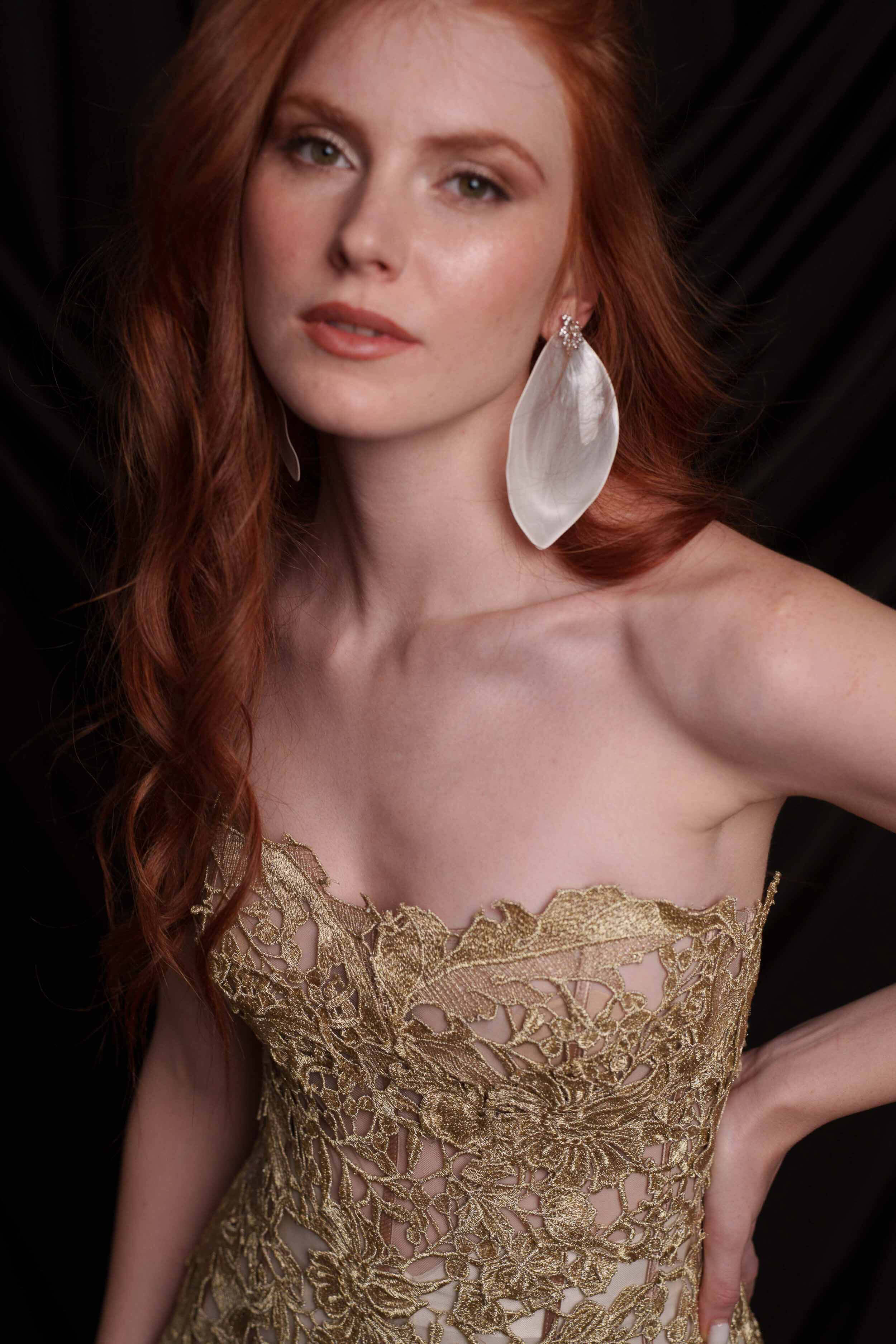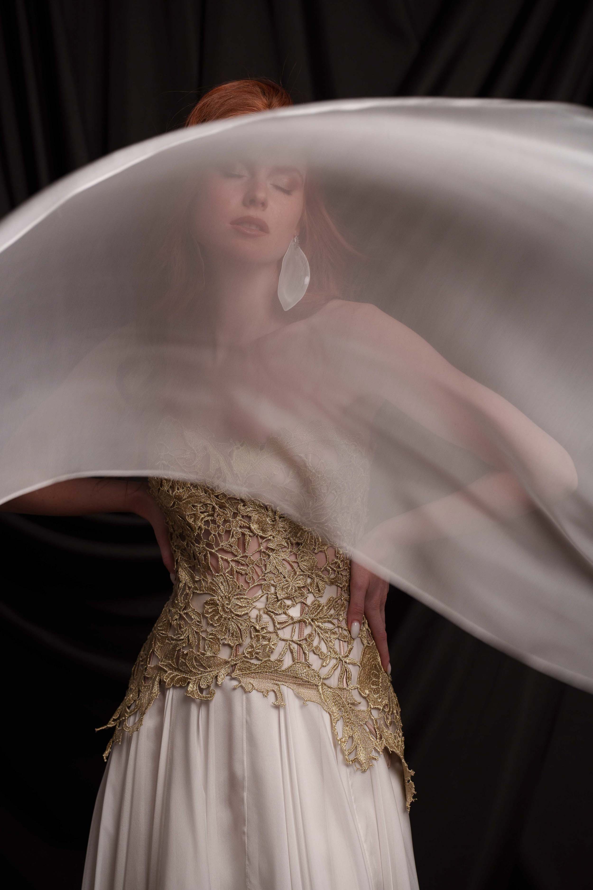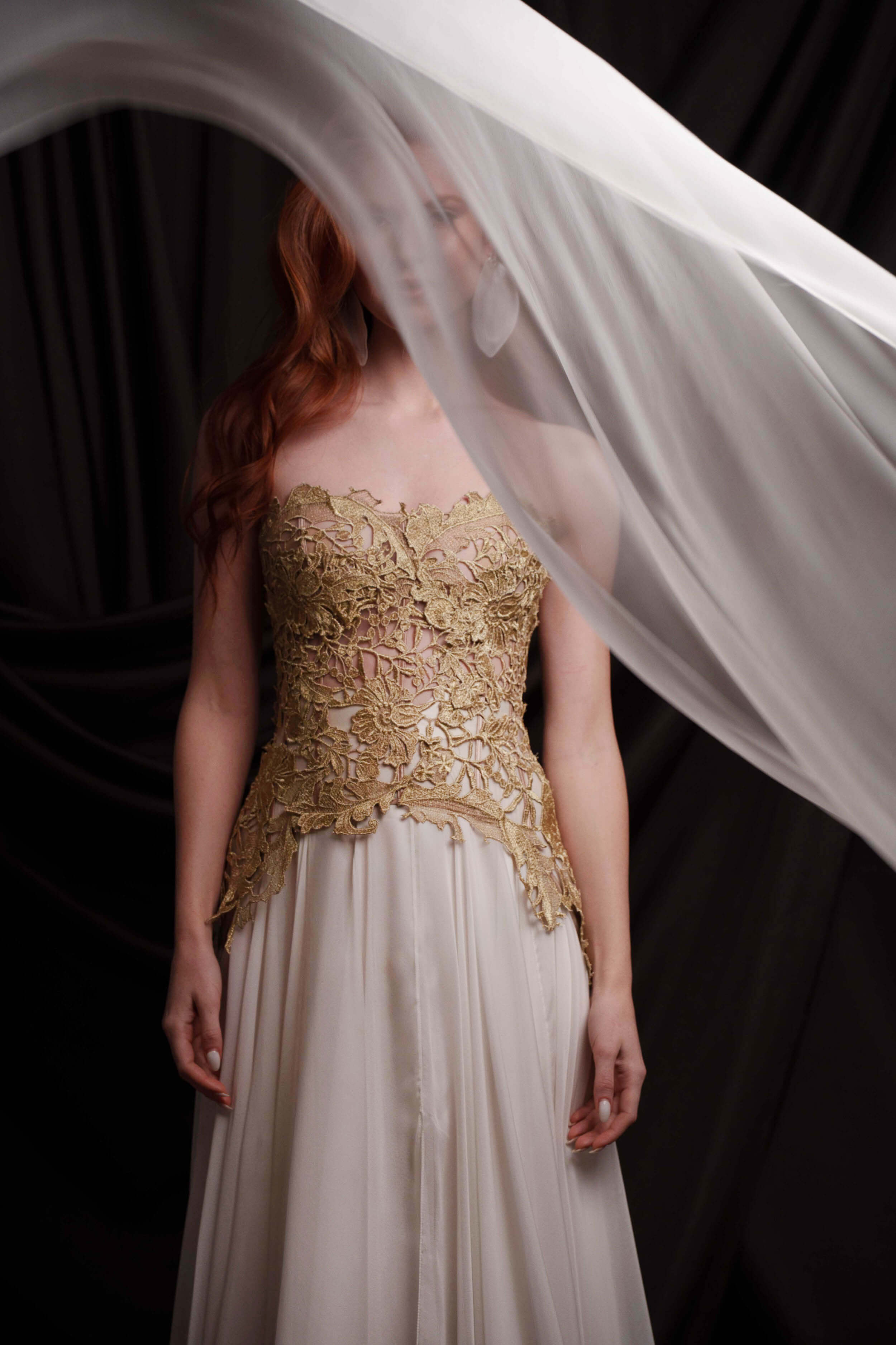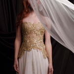 Nasrin is a sheer tulle corset with exceptional structure and support, decorated with layers of hand-deconstructed and manipulated old-gold guipure lace.