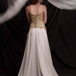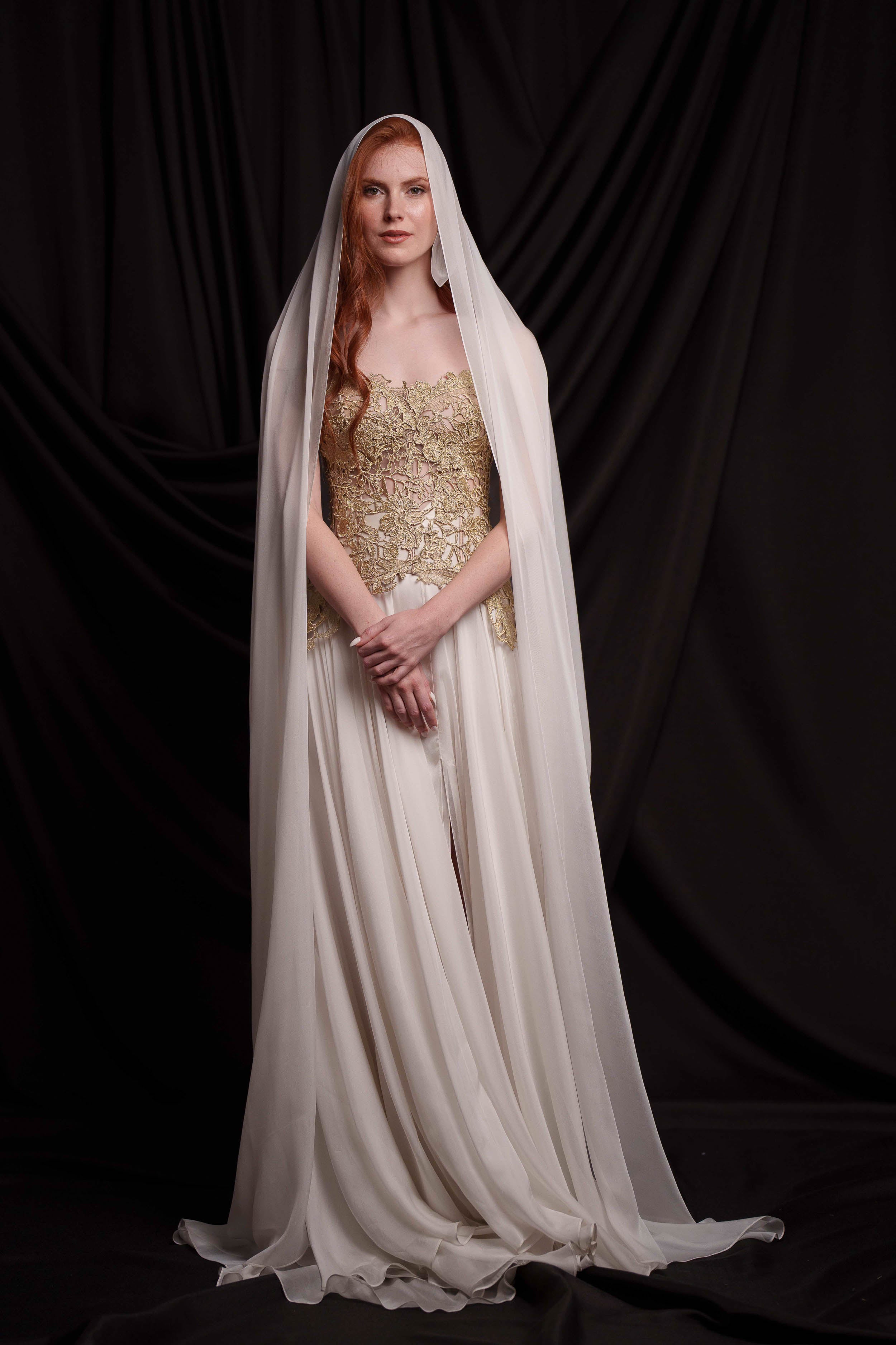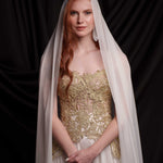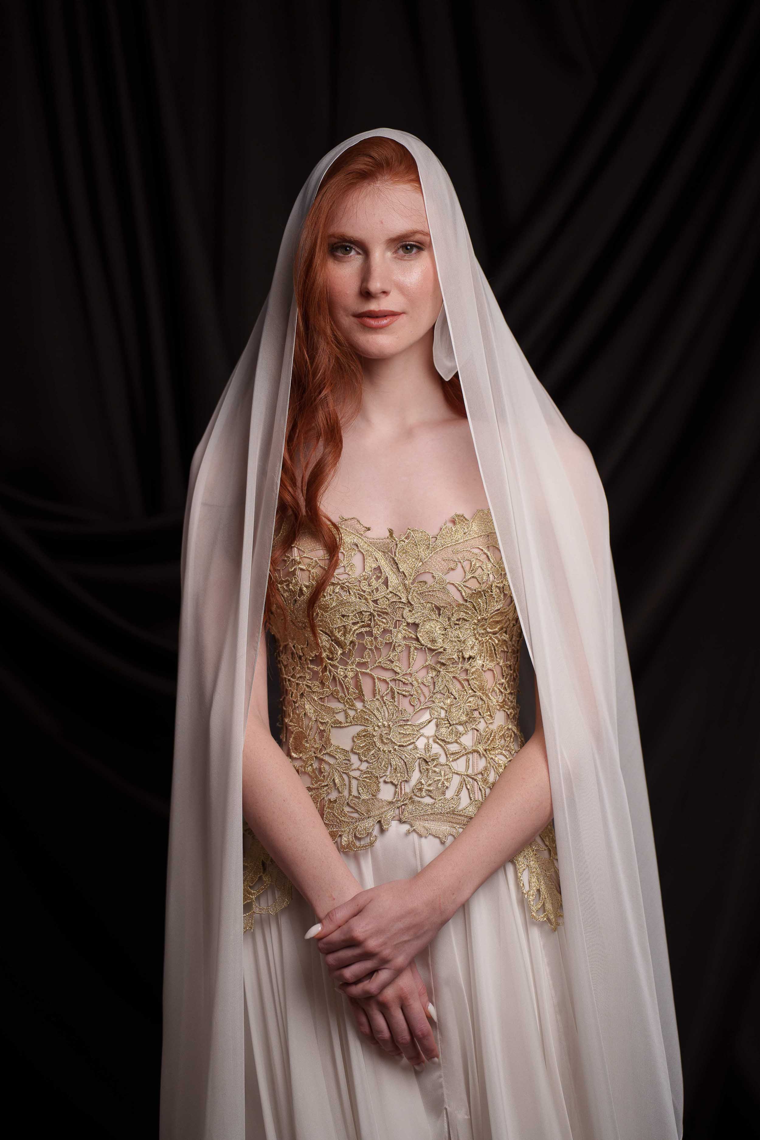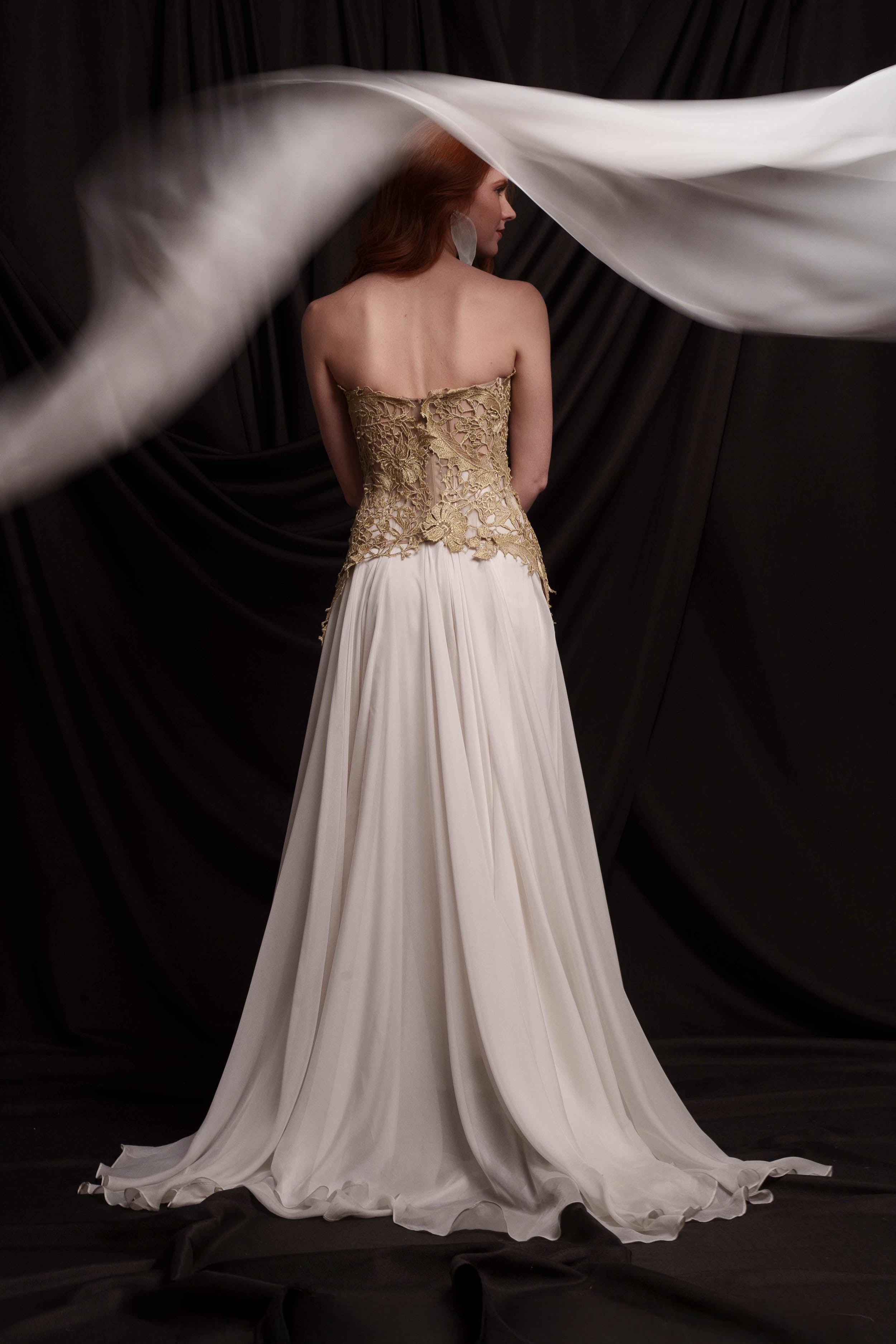 Nasrin is a sheer tulle corset with exceptional structure and support, decorated with layers of hand-deconstructed and manipulated old-gold guipure lace.